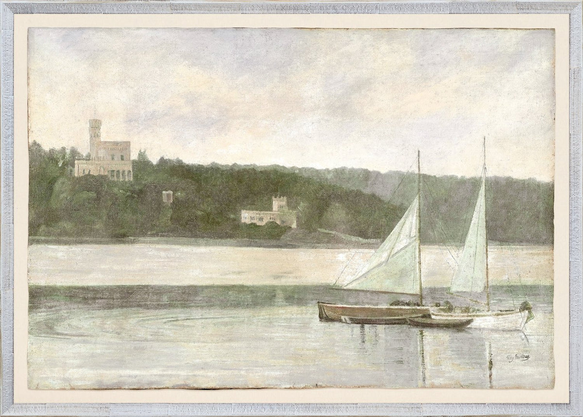 A peaceful depiction of sailboats on a tranquil lake with majestic castles in the background comes to life using cool tones of blue, green and taupe. A beautiful piece.