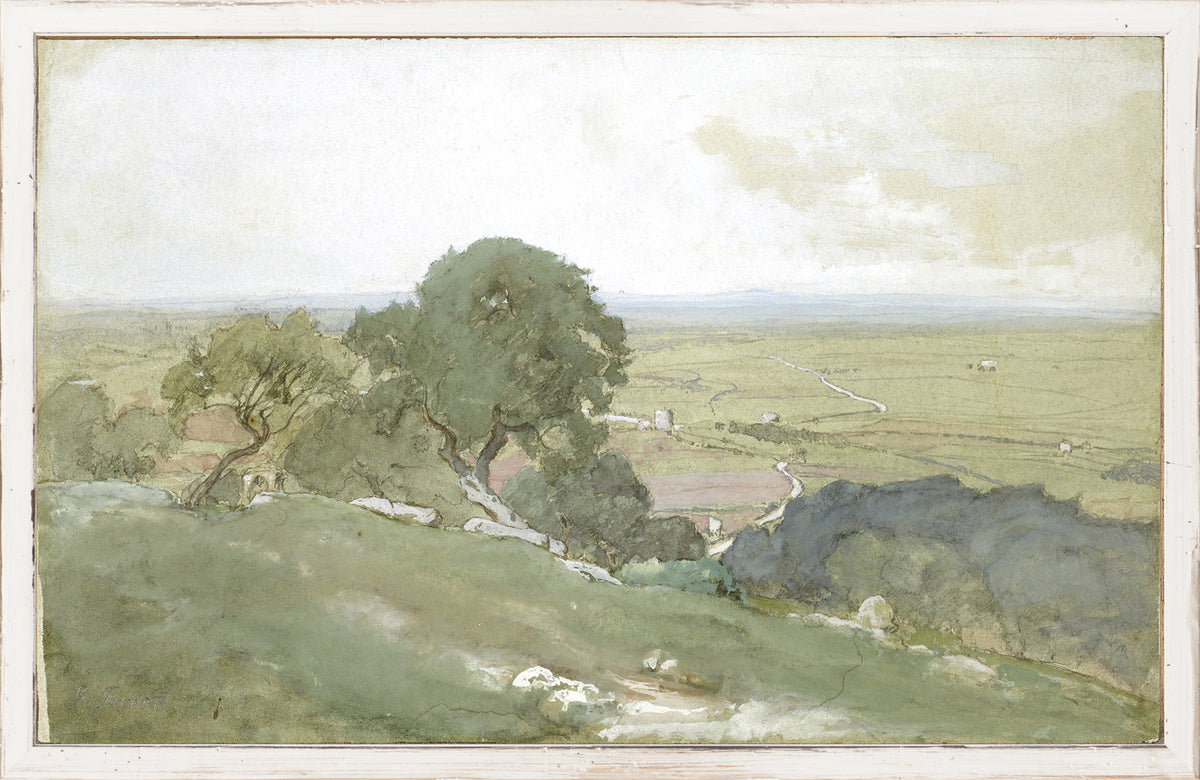 A richly coloured view of a cluster of striking trees and a peaceful countryside. Presented as a petite canvas on board with a distressed white frame.
