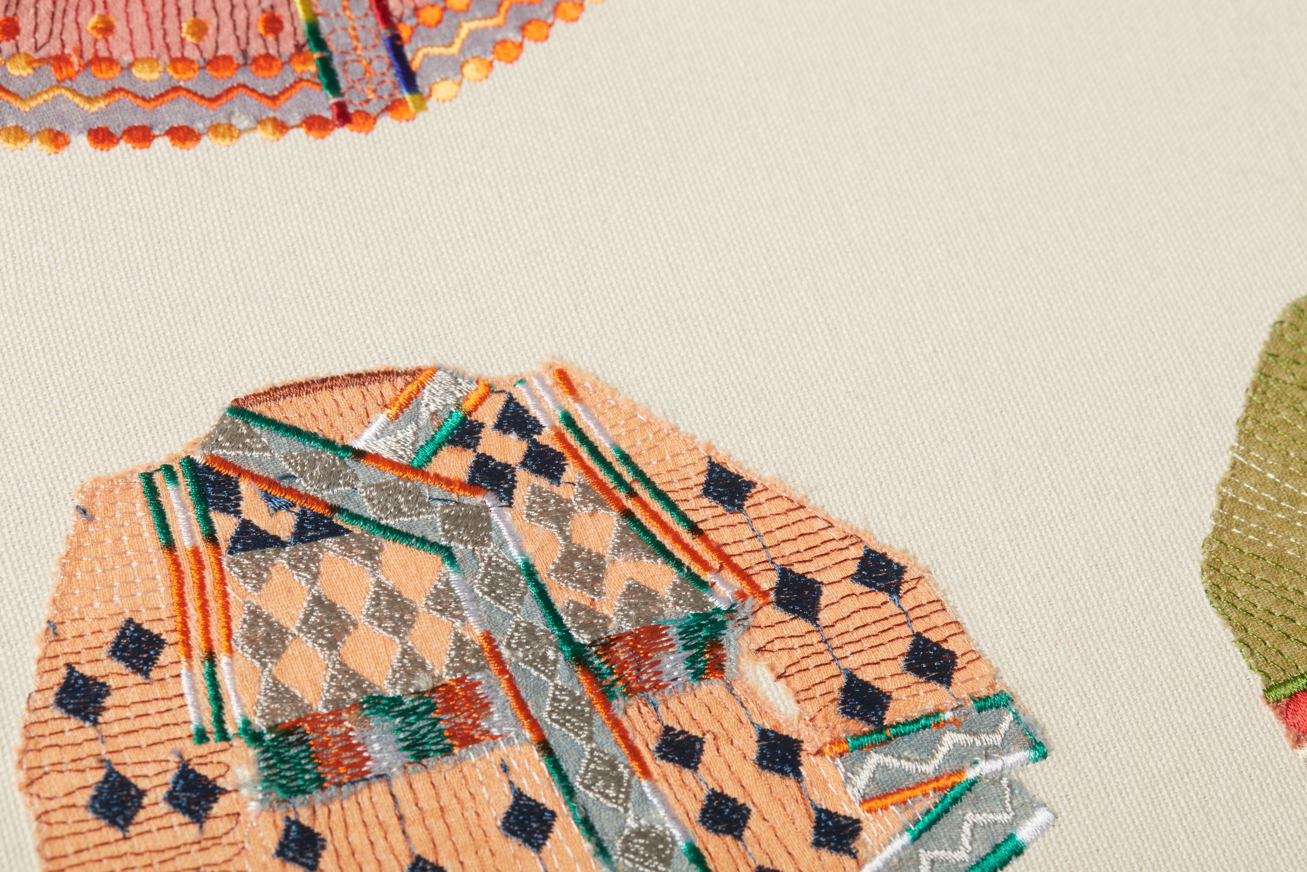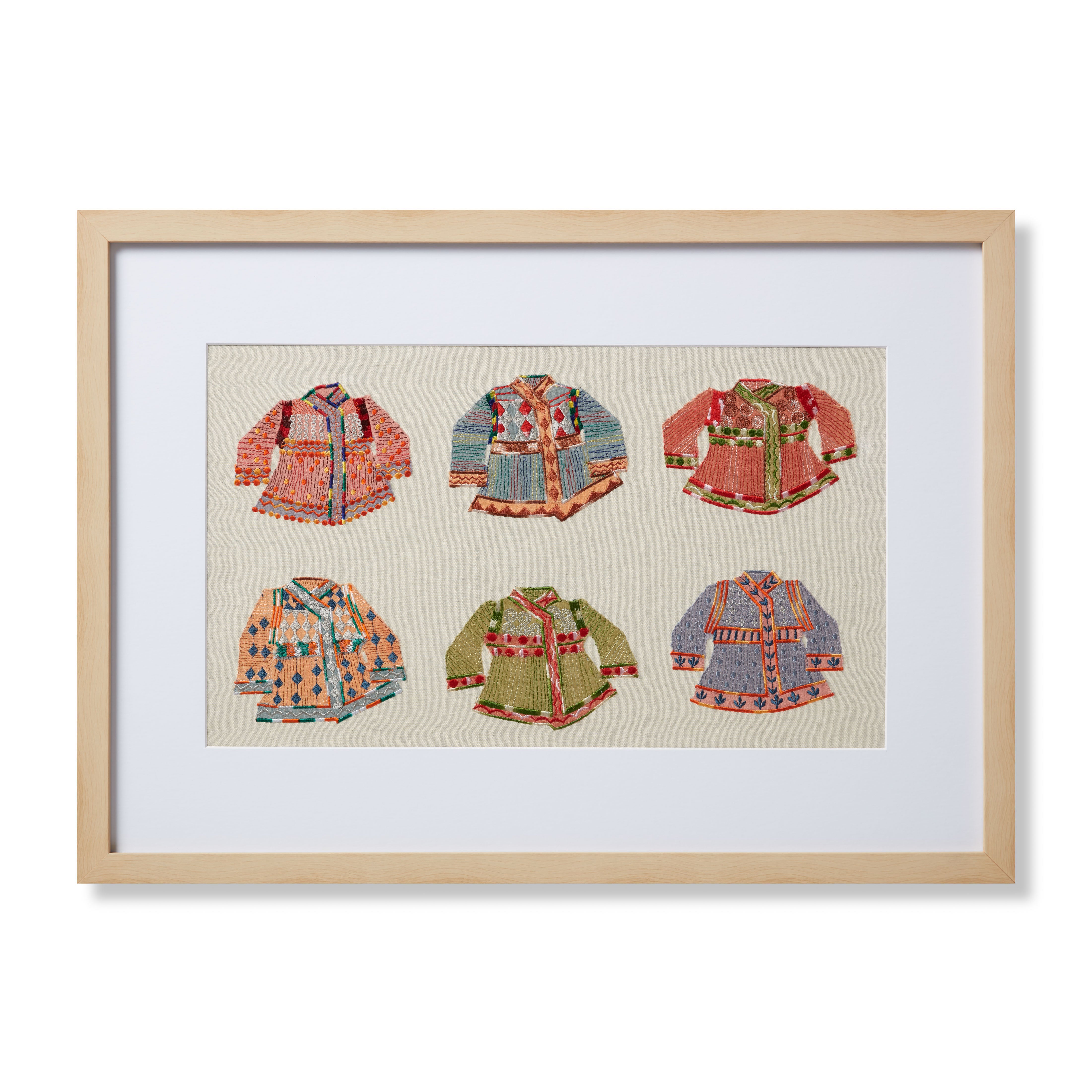 A coat of many colors could be the perfect art accent to brighten a bathroom or dressing space. Fun and colorful, this textile wall art is appliqued and embroidered.
