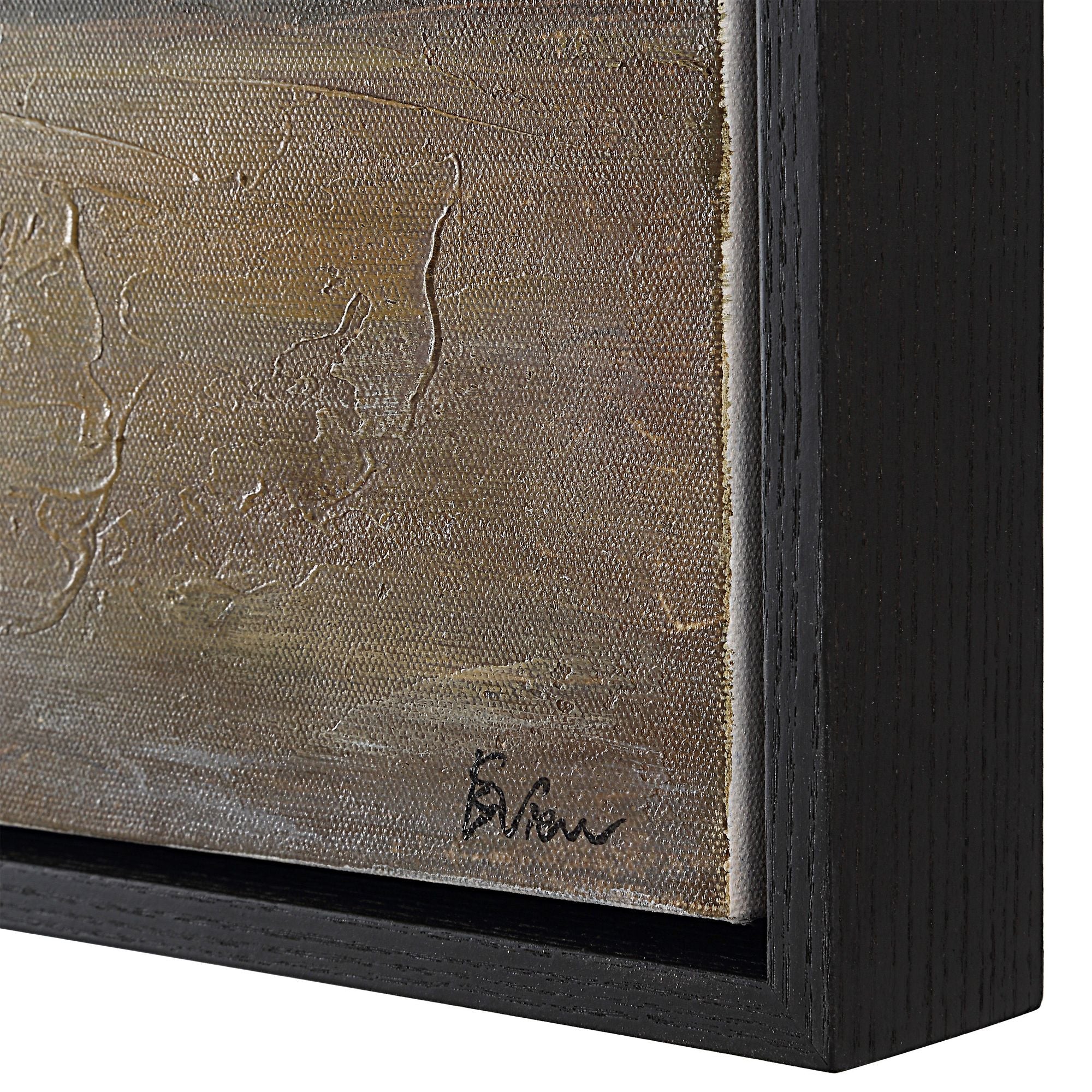 This abstract art is set to become a key player in any interior. Framed in matte black, this hand-painted canvas unites land and sky to bring drama and visual interest to the room. Attracting the attention of onlookers while making a statement of your design skills is easy when you have this stunning painting in the mix.