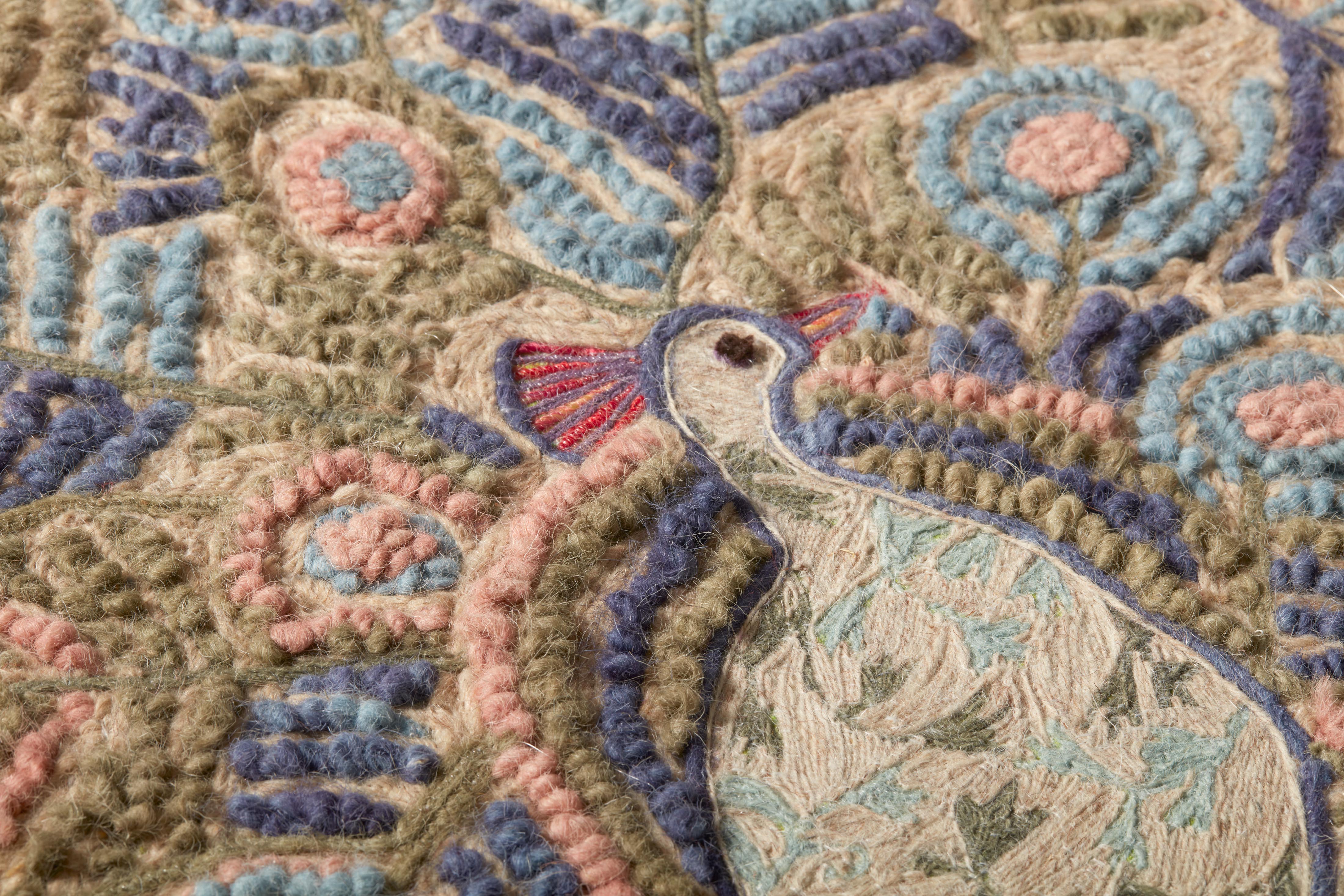 We’ve been inspired by one of Mother Nature’s best showoffs, the peacock. Created of chunky soft yarns, we love the lofty three-dimensional colors and the charming vintage appeal of this extroverted art piece.