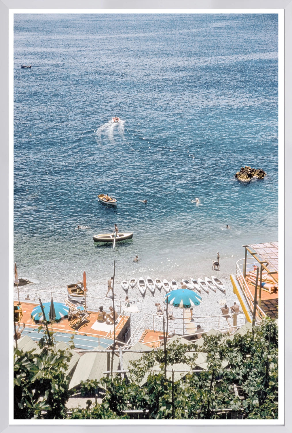 The high vantage point in this photograph provides a clear view of this busy beach. Sunbathers and boaters alike are enjoying the warm summer rays on the coast.