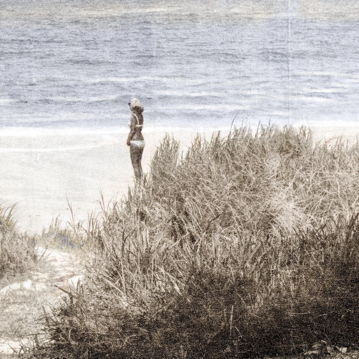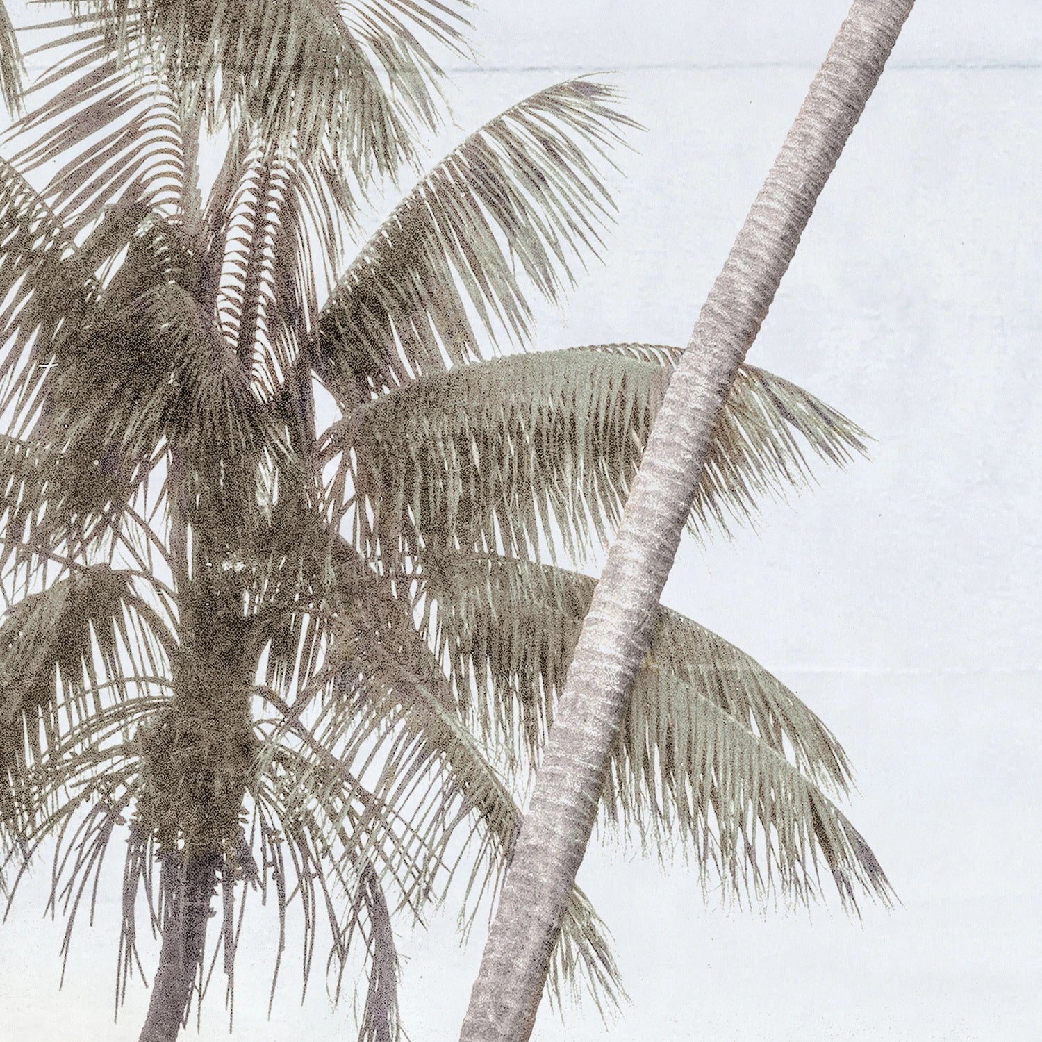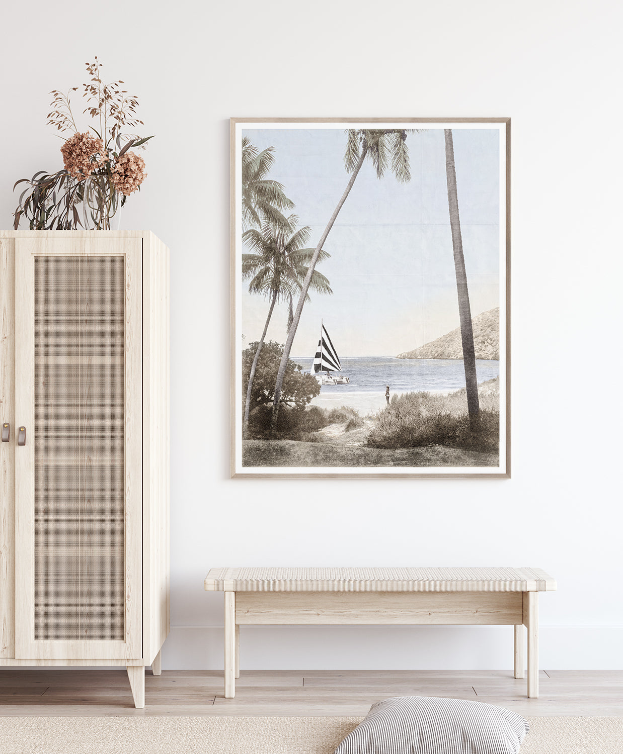 A catamaran floats near shore in this coastal photograph on a creased paper texture. The soft blues and taupe bring a dreamy quality to the image.