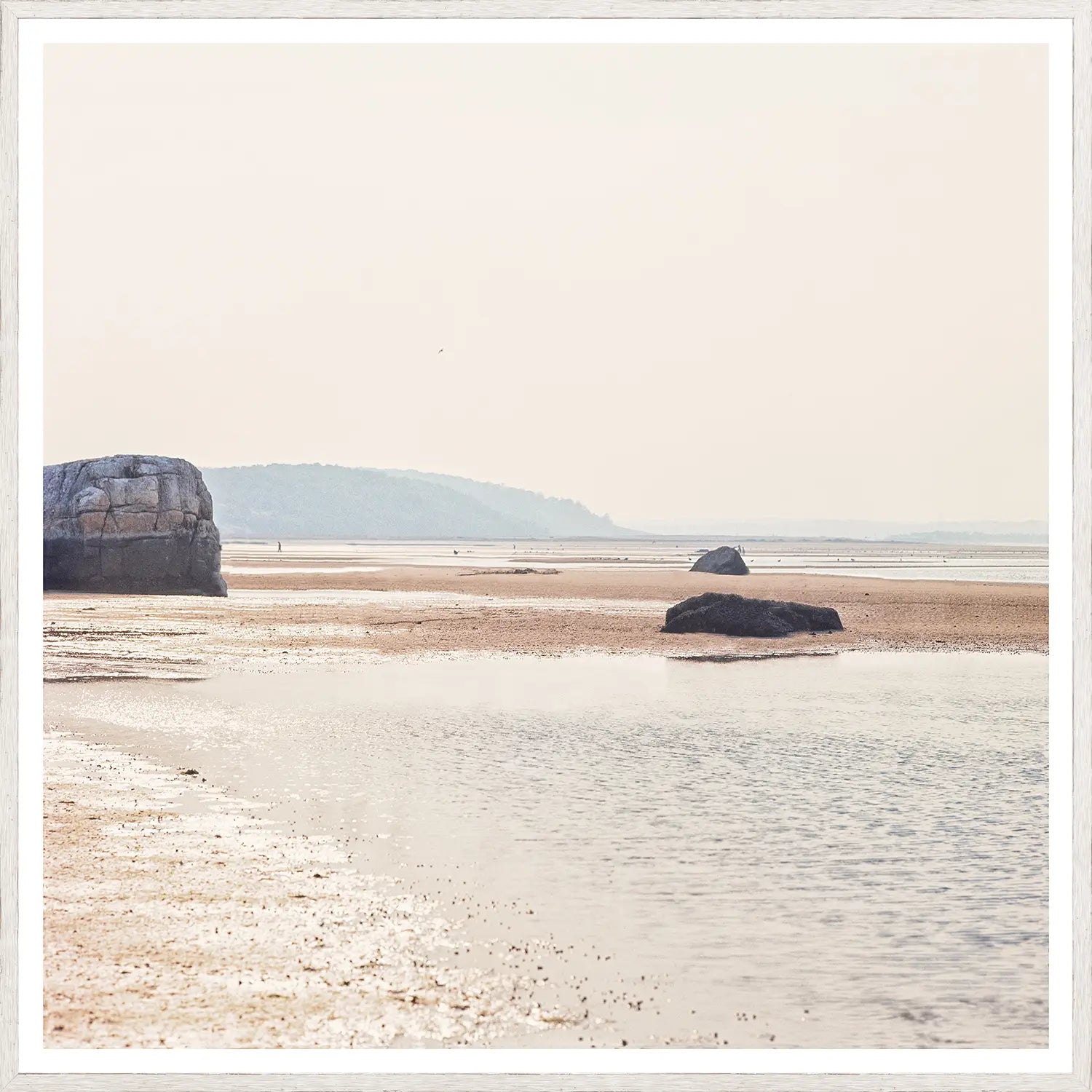 A serene lake scene is captured in this beautiful photograph. The soft blues and taupe of the image combine with a creased paper texture to create a sense of dreamy nostalgia.