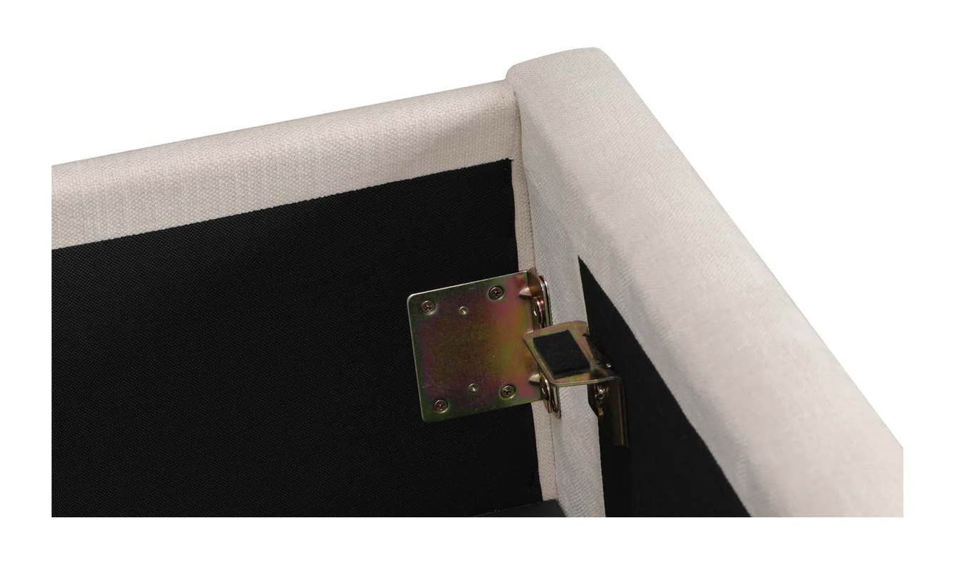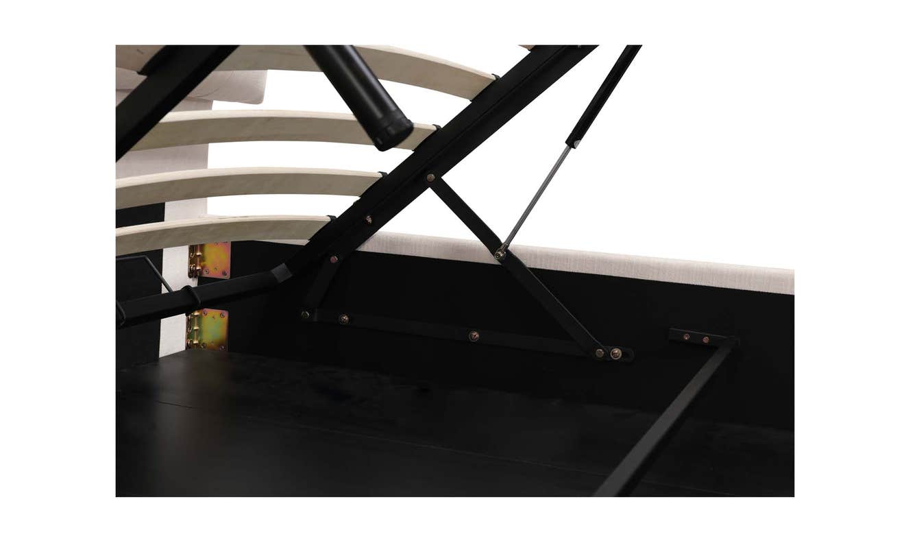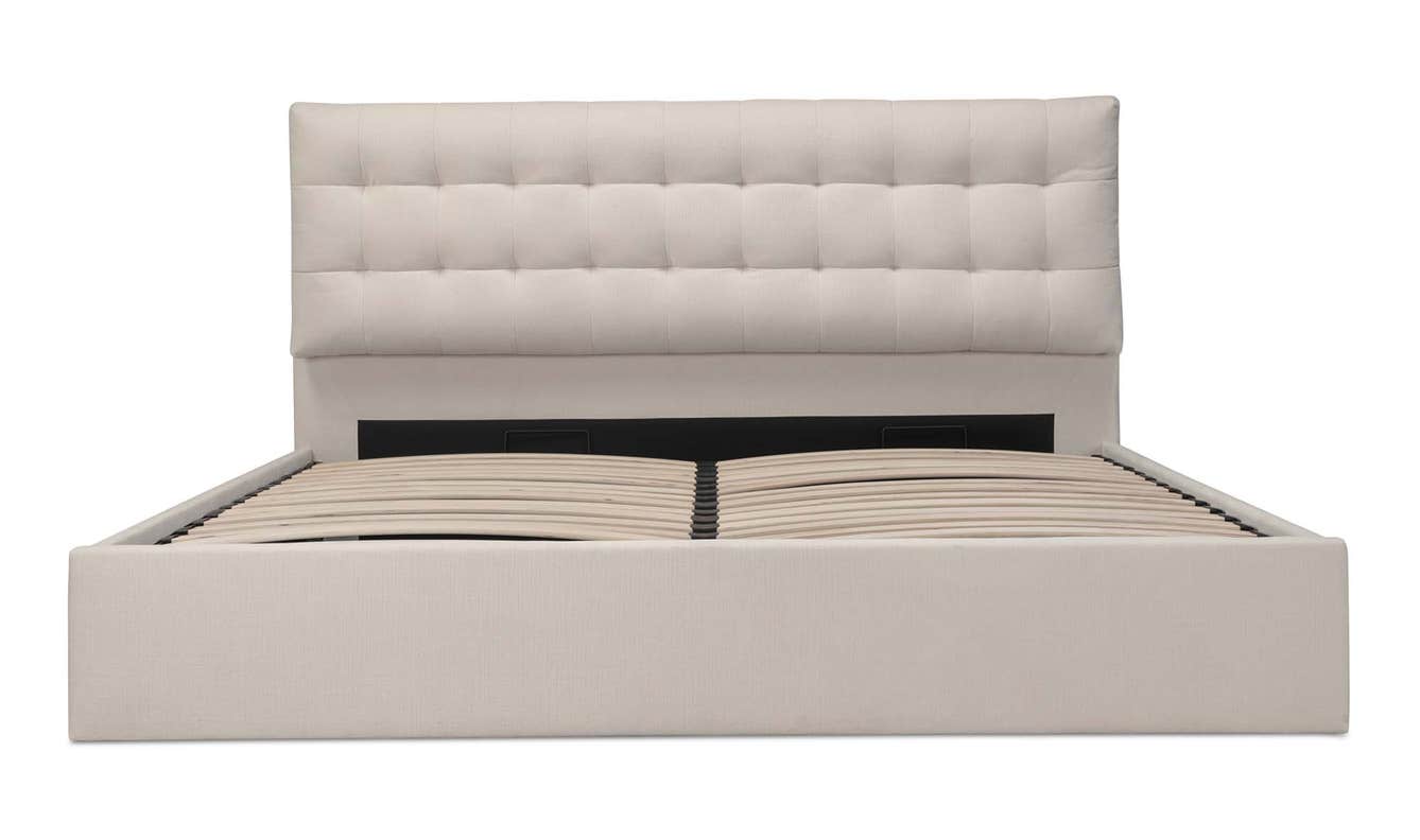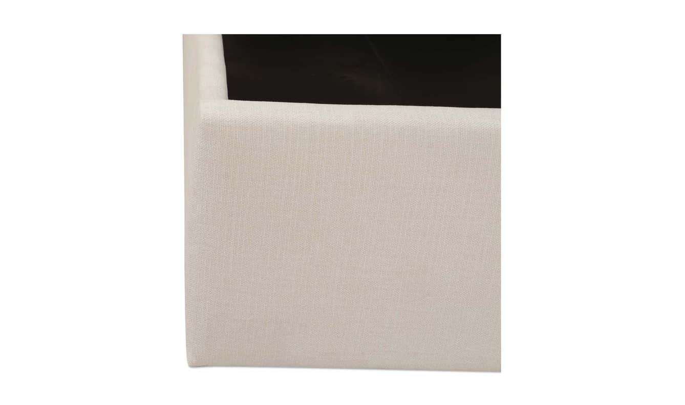 The Sebastian storage bed's double-layered headboard, featuring a tufted second layer and pillow-like front, creates a serene sanctuary. Crafted from solid wood, foam-filled, and upholstered in fabric upholstery, it promises enduring comfort. An innovative hydraulic lift system reveals discreet storage, seamlessly blending functionality with sophistication; every detail speaks to understated luxury and practical sensibilities.