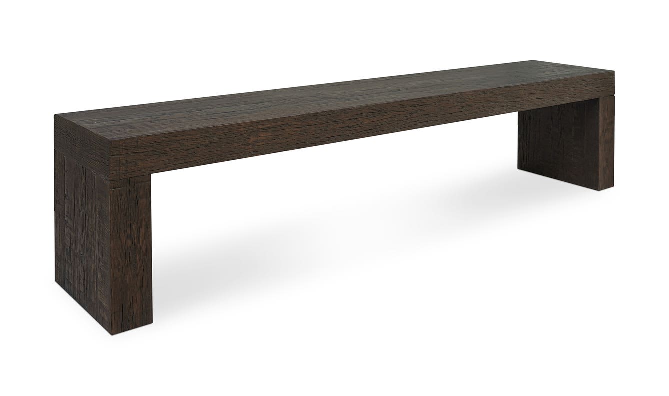 Hand-painted and crafted from solid reclaimed oak, beautiful natural grains, knots and imperfections take center stage with the Evander dining bench. Its modern, blocked construction balances rustic and contemporary design with organic energy, adding character and warmth to any space.
