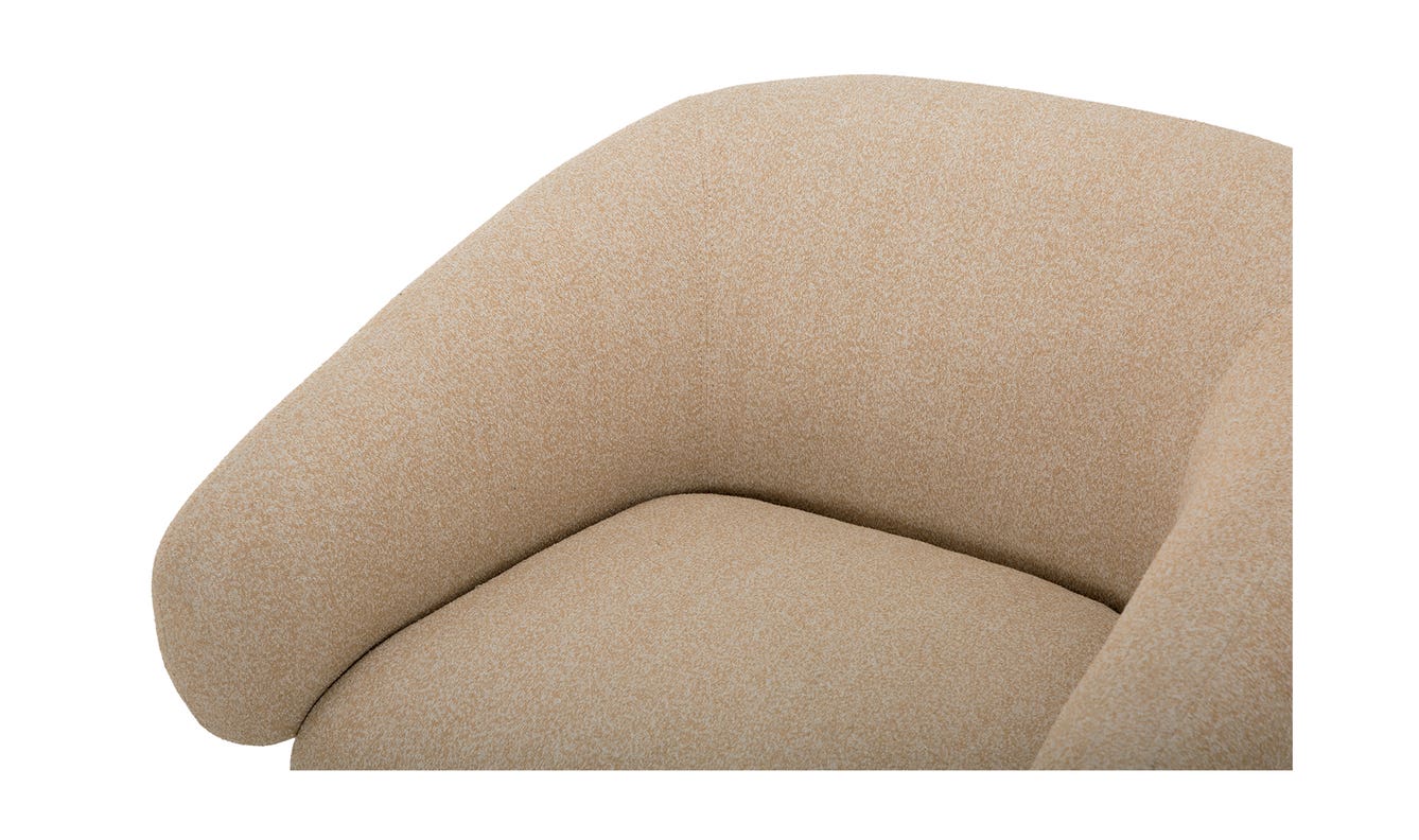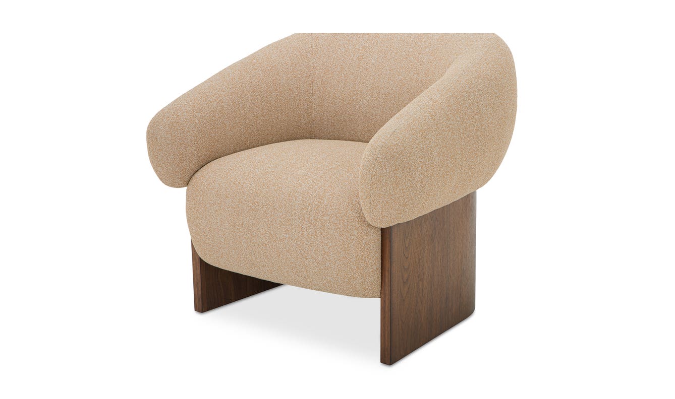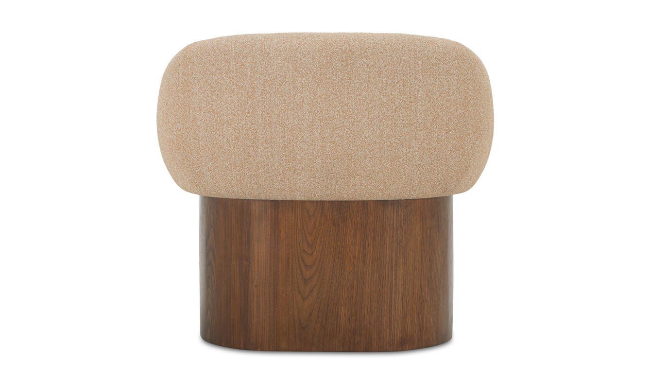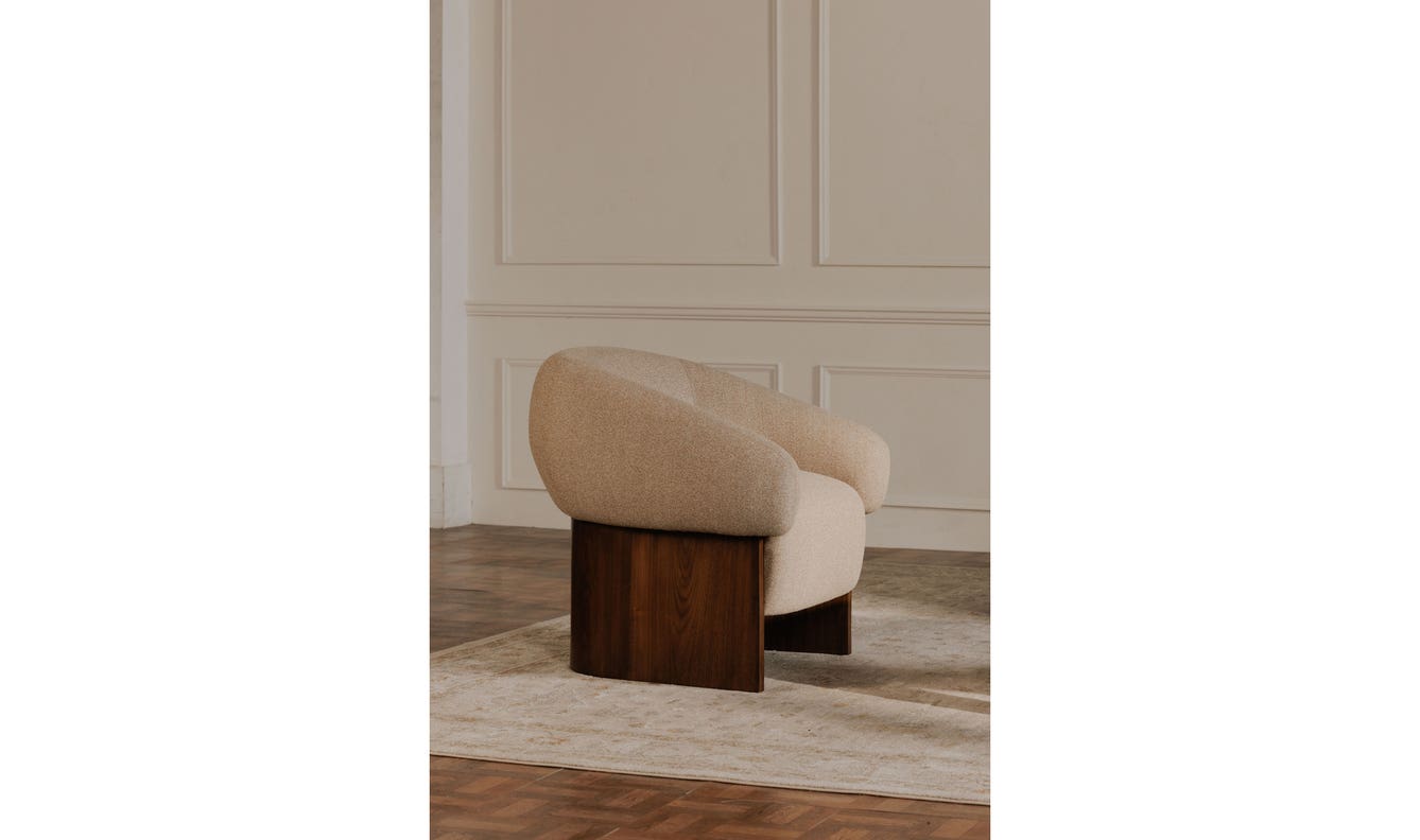 The Otto accent chair merges the robust grace of a walnut veneer over solid rubber wood base with the delicate comfort of a plush, curved back and upholstered in a flecked micro bouclé of 100% recycled GRS-certified polyester that is OEKO Tex 100. With its nuanced texture, this piece floats atop a wooden foundation that brings lightness into any space.