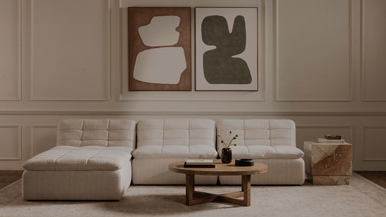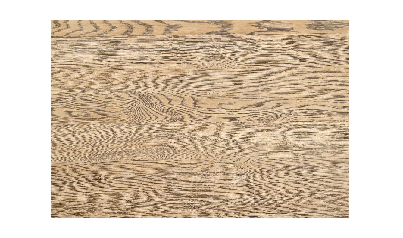 Crafted from solid oak, the Joel coffee table's thick round top features a thoughtfully crafted V-groove, adding a visual lightness to the substantial surface. The geometric base, with crisscrossing stretchers, grounds the piece with quiet confidence. A natural, wire-brushed finish enhances the oak's organic beauty, creating a focal point of understated elegance.