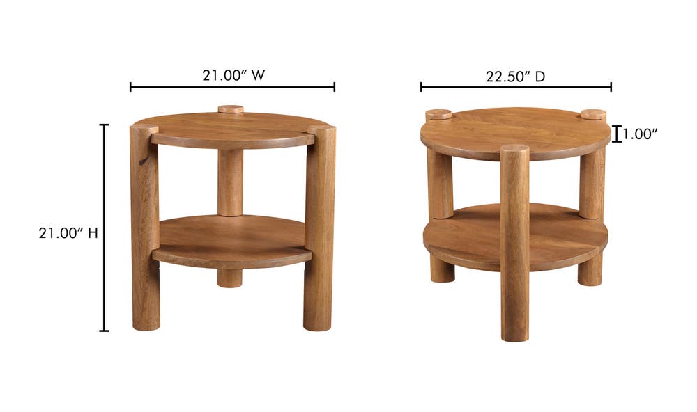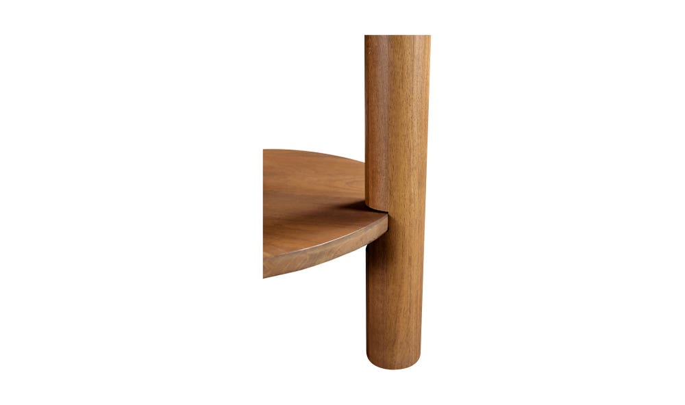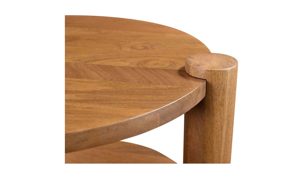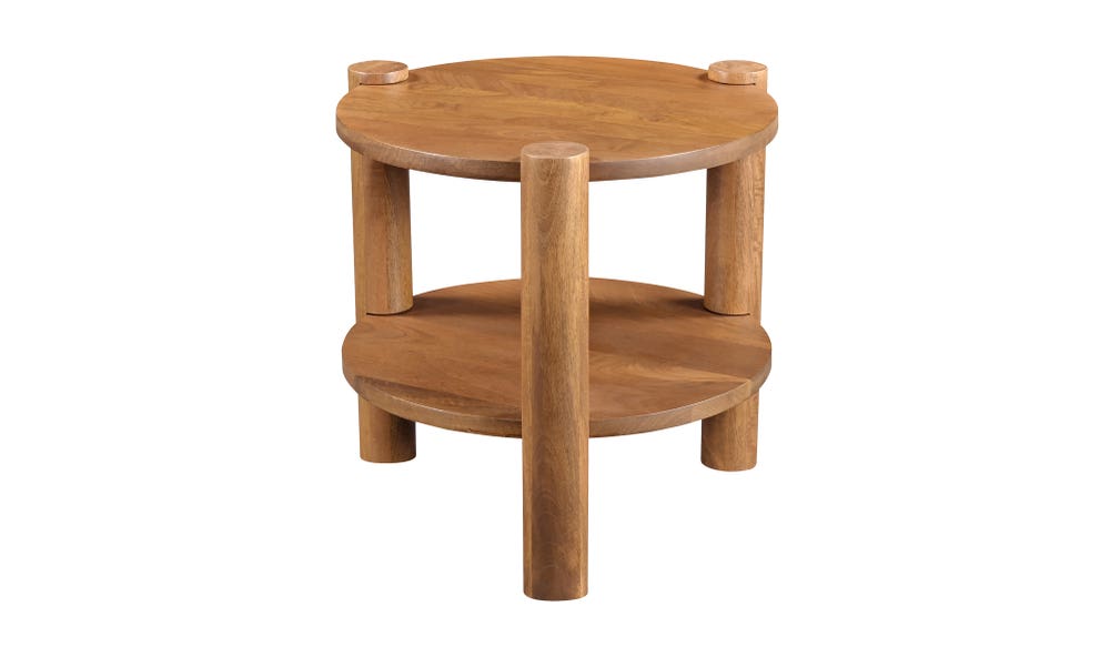 The Olsen accent table brings a vintage appeal and timeless charm, as its solid mango wood construction and warm brown finish add a rustic elegance. The cylindrical legs and meticulous joinery details are artfully incorporated alongside open storage. This piece effortlessly brings a sense of airiness and refreshing lightness to any space