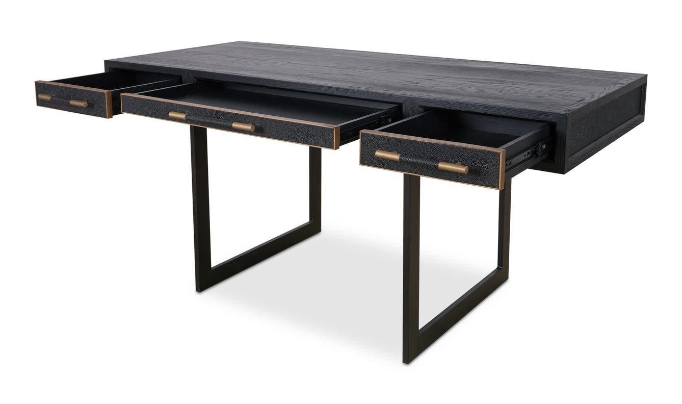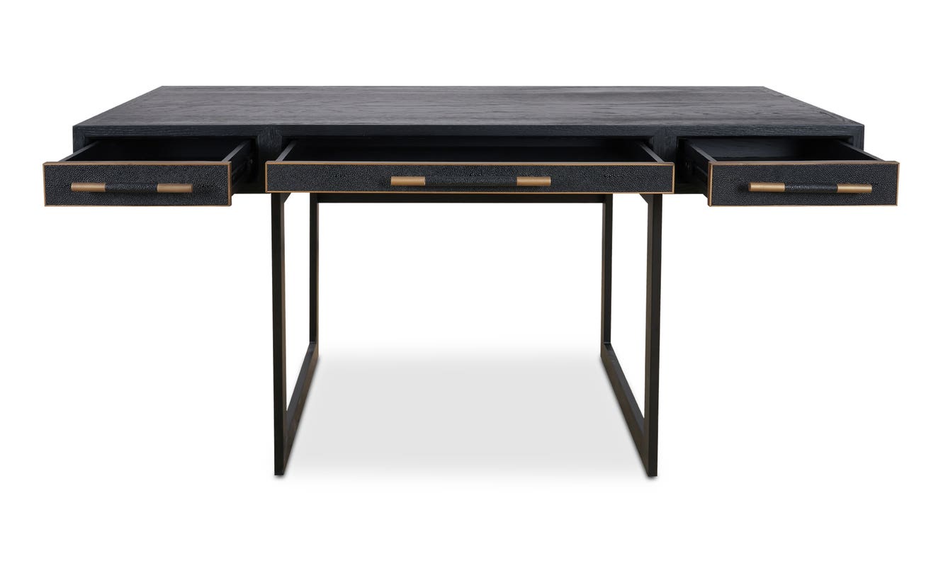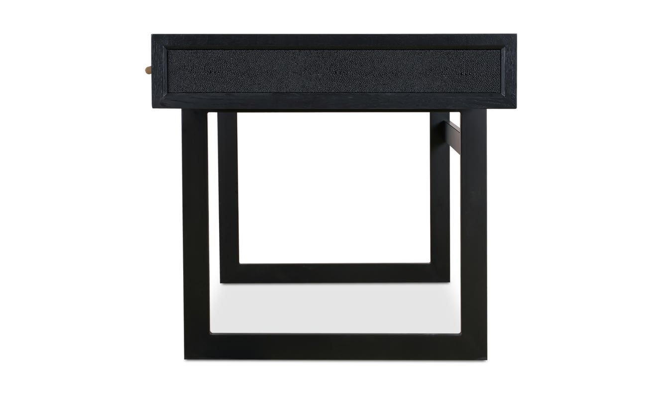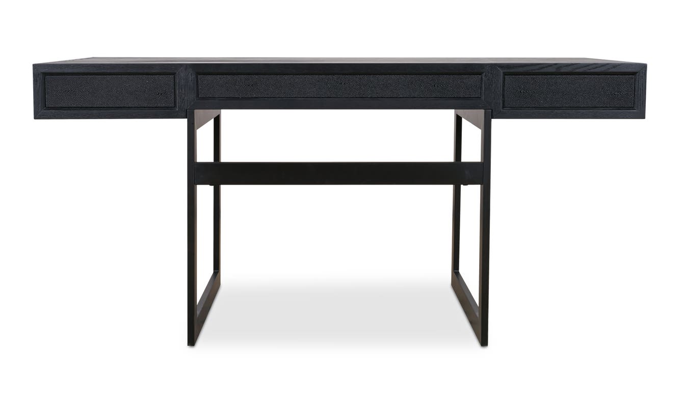 With each item upholstered in the highest quality vegan leather shagreen, the Mako collection brings effortless style, visual texture and substance to your living space. With a three-drawer design and spacious tabletop, this desk offers an elemental chic to any office or living space.