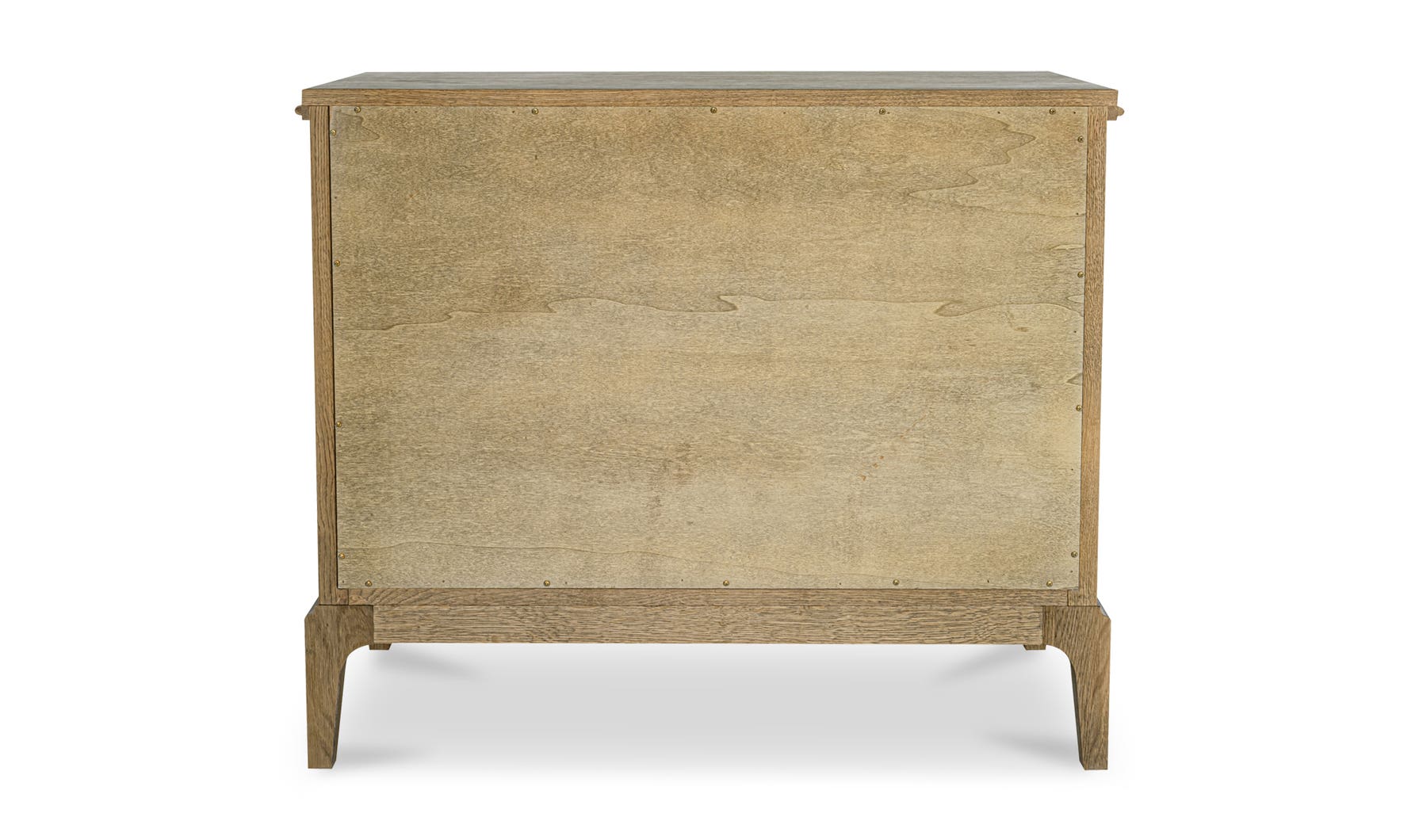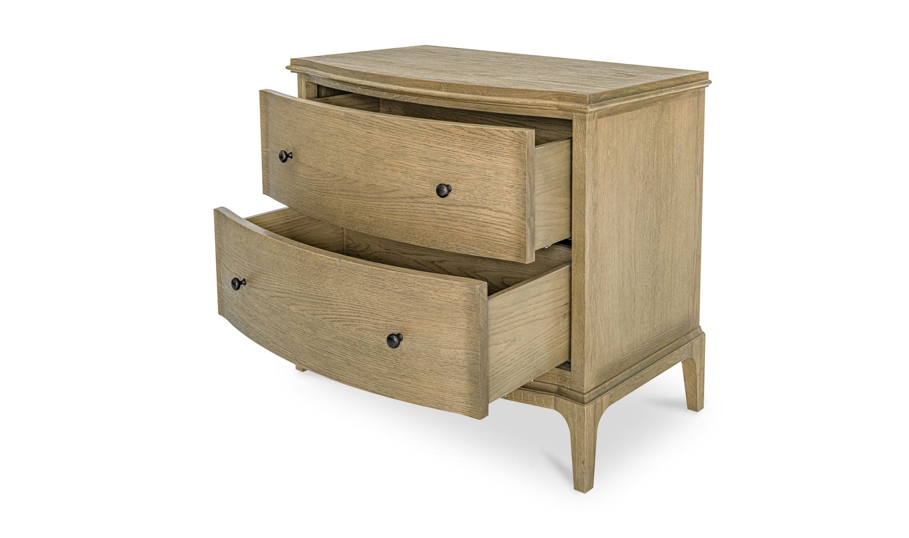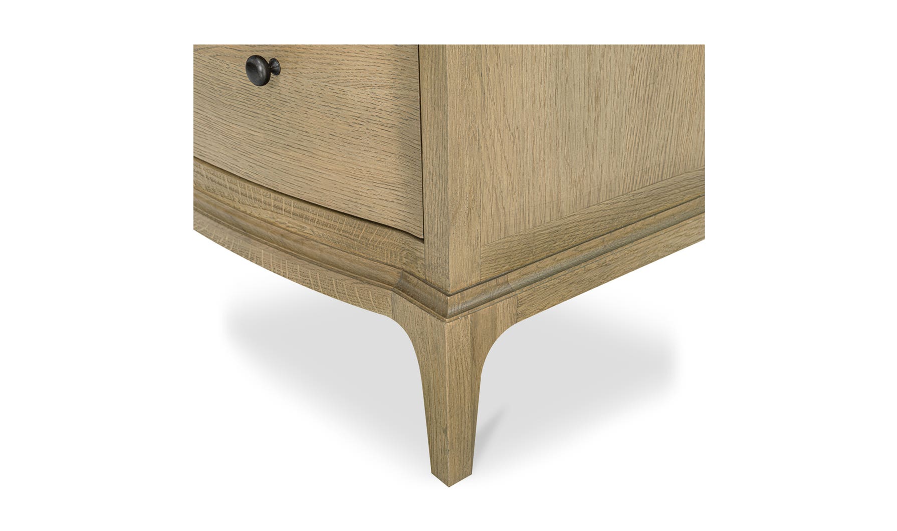 The Sadie nightstand's gentle curves and wire-brushed oak finish embrace modern traditionalism. The artfully designed overhang with rounded edges and curved front offers a soothing visual rhythm. Two spacious drawers provide ample storage, balancing form and function.