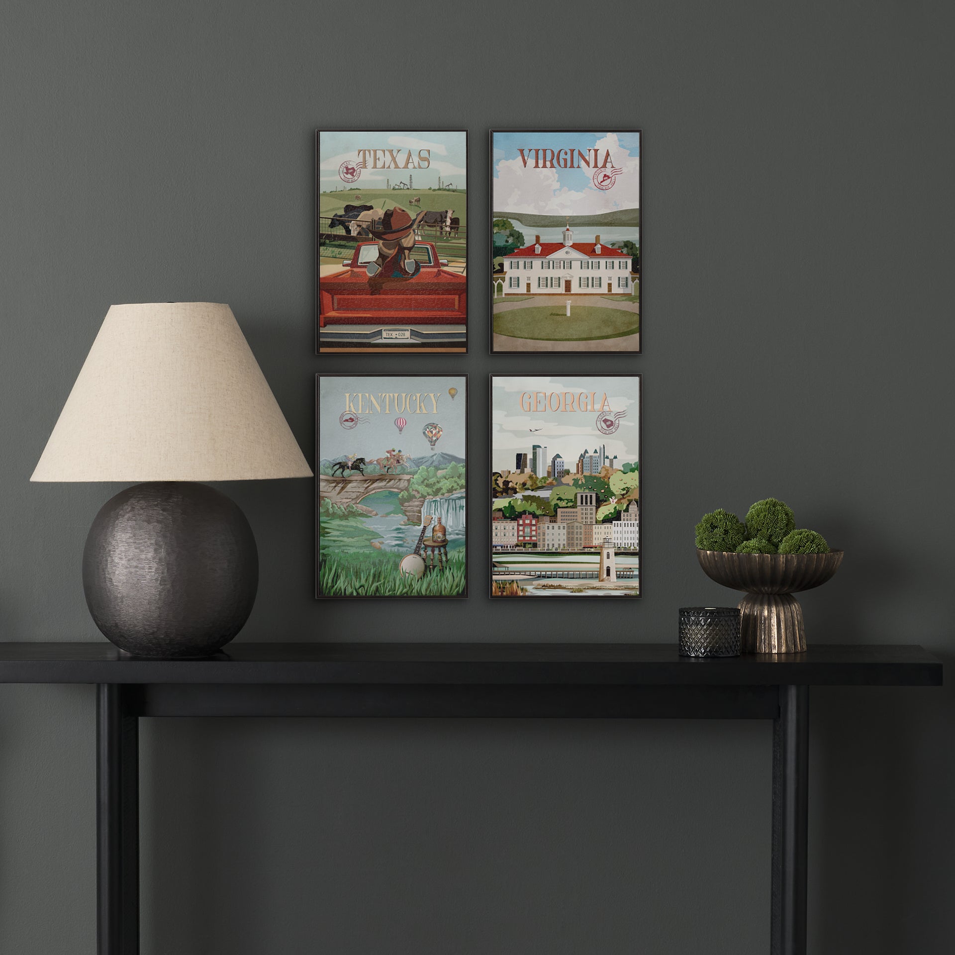 Embrace the rugged charm of the Lone Star State with Mercana’s Texas Go USA. This hand-embellished framed art blends earthy browns, greens, and reds to depict Texas’s vast fields and iconic oil derricks in timeless style.