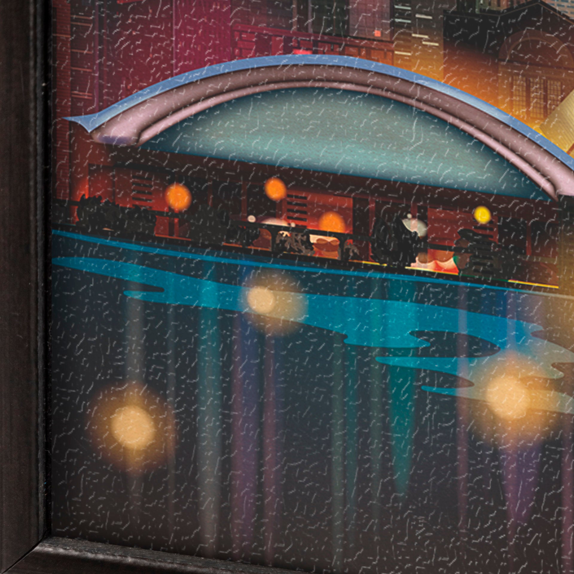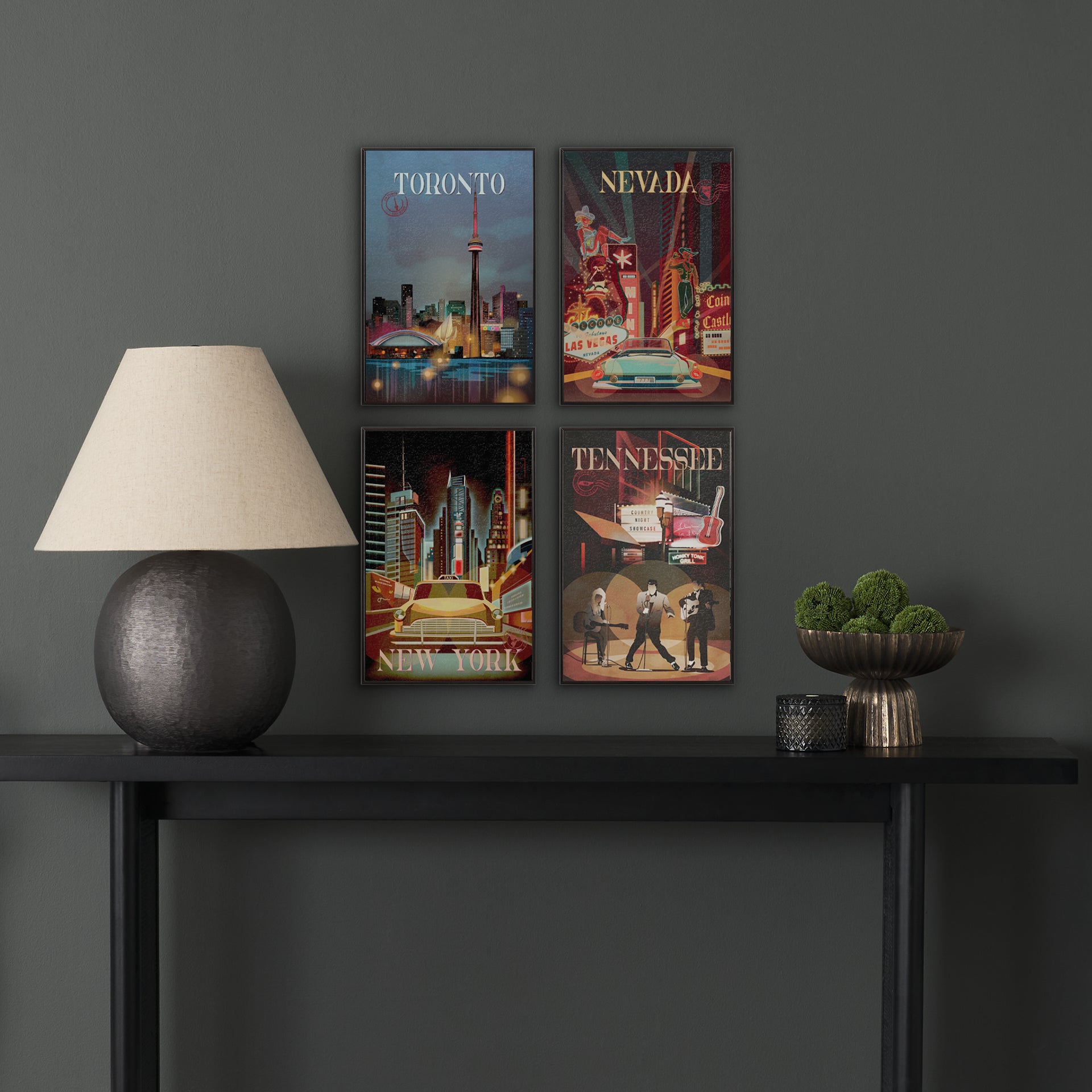Celebrate Toronto’s dazzling skyline with Mercana’s Toronto Go Canada. This hand-embellished framed print showcases the CN Tower amid shimmering skyscrapers in deep blues and moody purples, capturing the city’s modern elegance and vibrant energy.