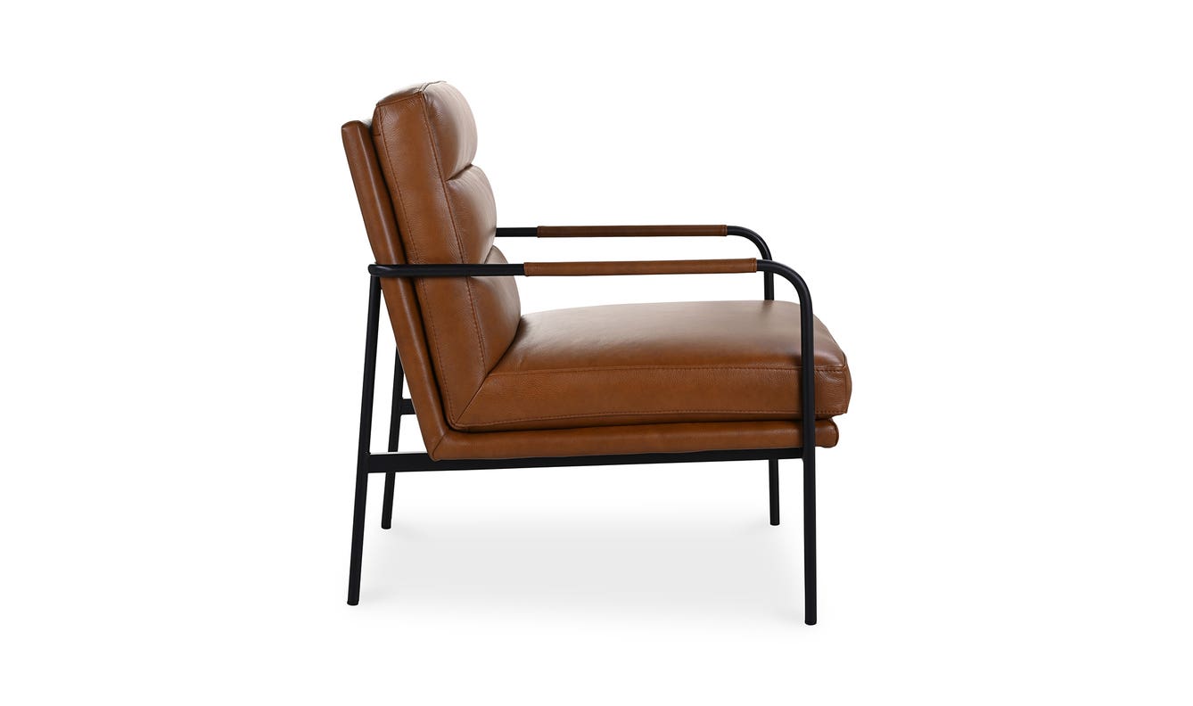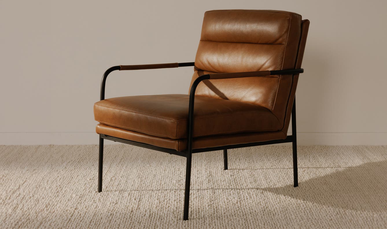 Swathed in top-grain, chestnut-hued leather, the Verlaine armchair develops a rich patina over time. The back support cushion boasts subtle channeling, while the seat is expertly crafted with foam and zigzag springs to ensure a luxurious lounging experience. Its slender, powder-coated metal frame is accentuated by the tasteful addition of leather-wrapped arms punctuating the piece perfectly.