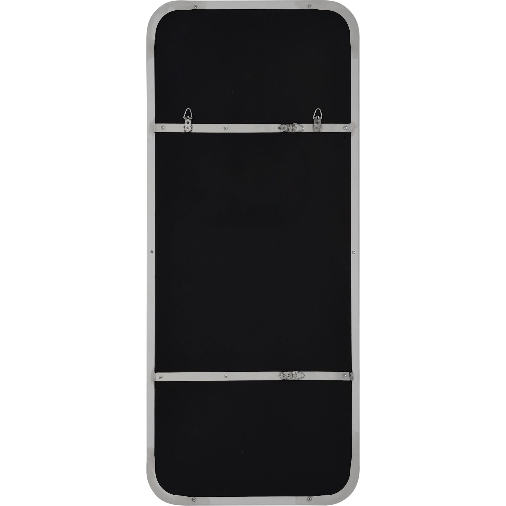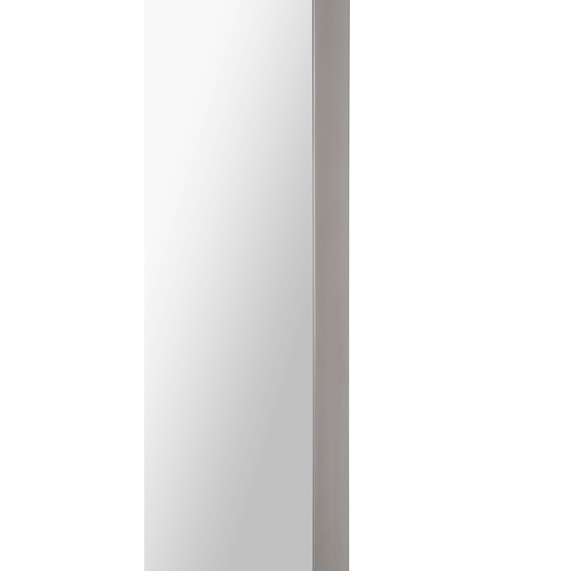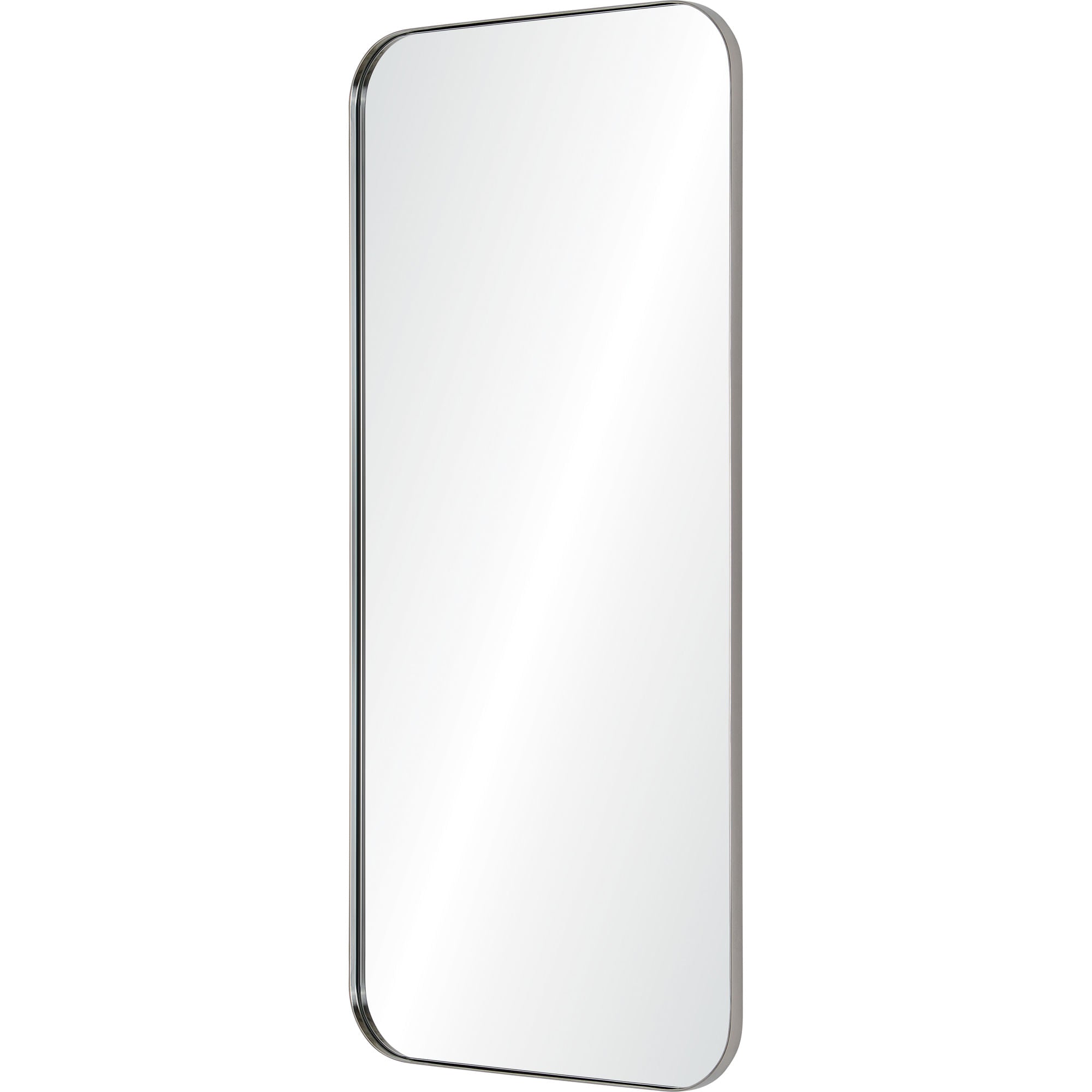 A fresh take on a sleekly styled mirror. The stainless-steel frame in a satin nickel finish adds a modern look to your powder room. The rounded edges of the rectangular design give it a unique appeal.