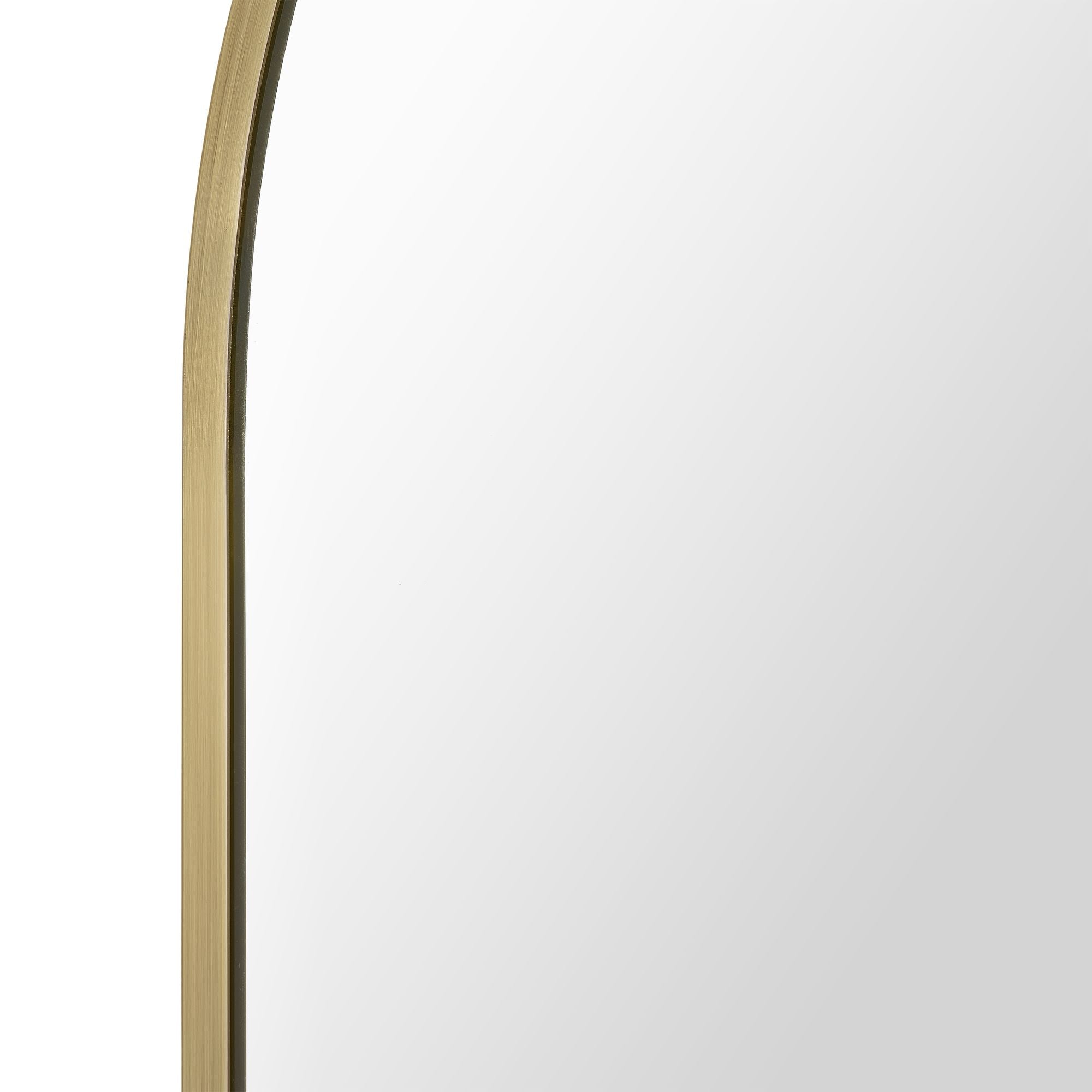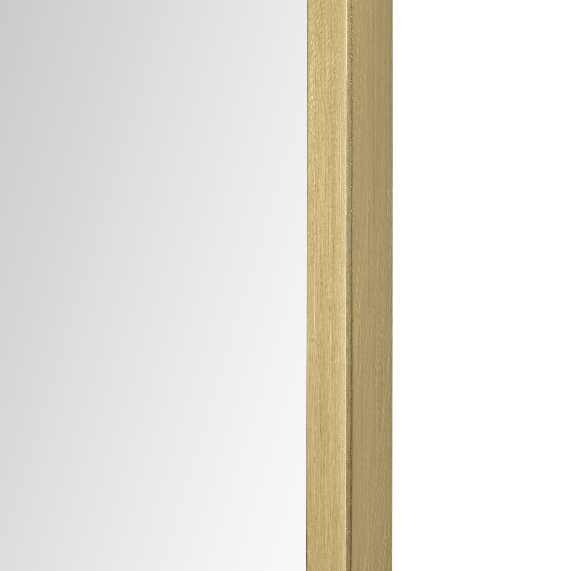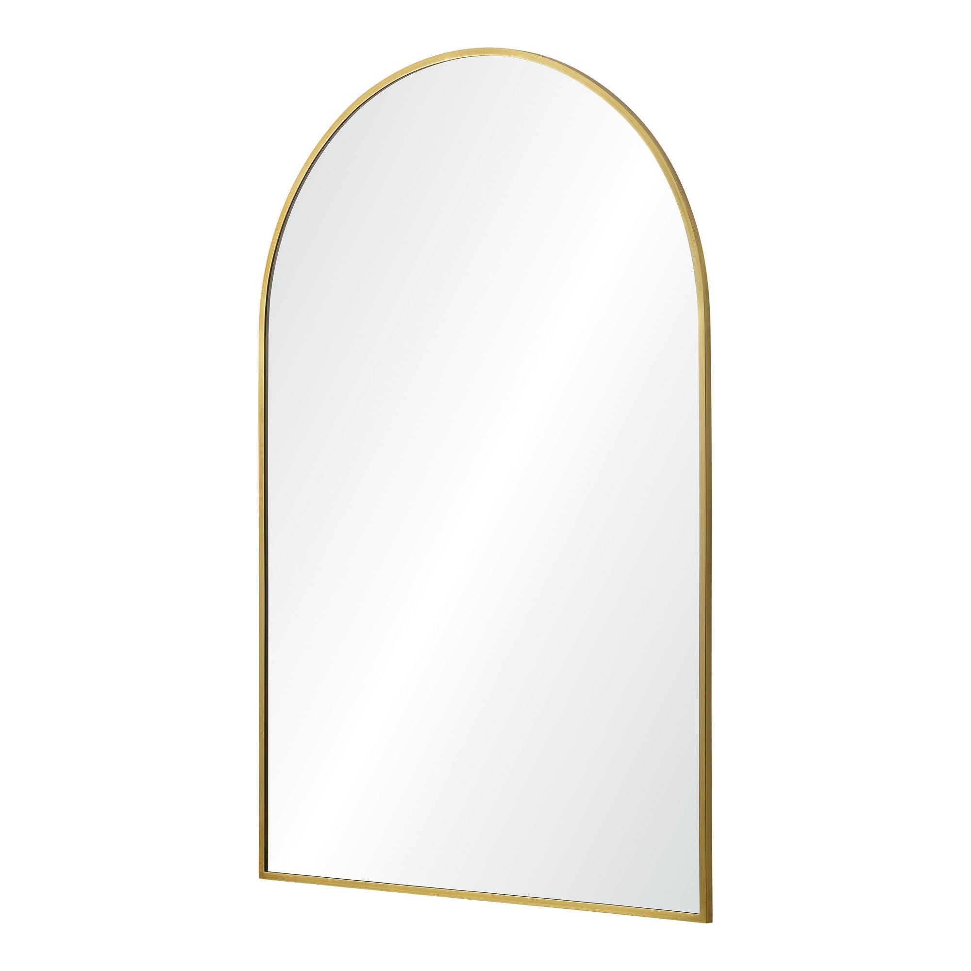 A curving structure adds a formality to the form of this minimal mirror design. With a 24-inch width and 36-inch height, it allows for both hanging and resting above furnishing arrangements. The gleaming satin brass plated iron frame provides a dazzling detail and creates compatibility with contemporary, classic and mid-century modern interiors.