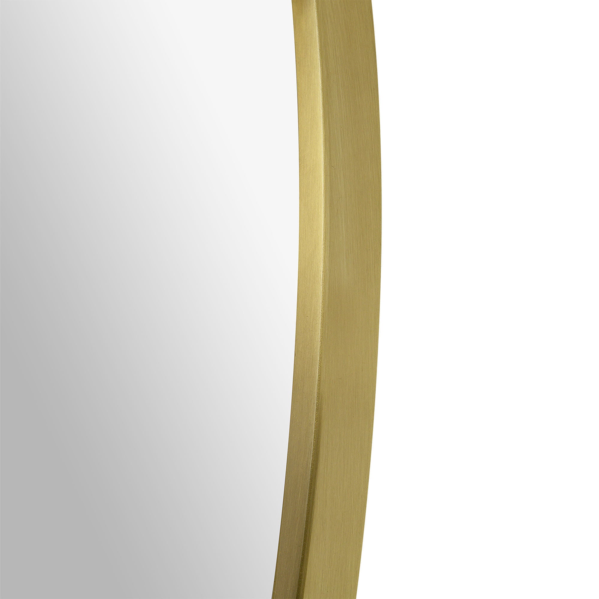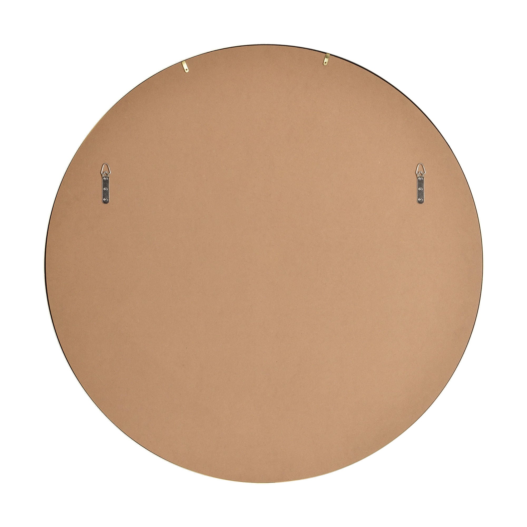 A satin brass frame gives this round mirror a warm radiance. Set above a prominent piece of furniture, this wallmount mirror is intended to highlight the furnishings in its midst and allow for those in the home to take in their appearance. This framed mirror can easily blend into its surroundings if that is the intention, but it has the power to act as a work of art in a minimalist setting as well.