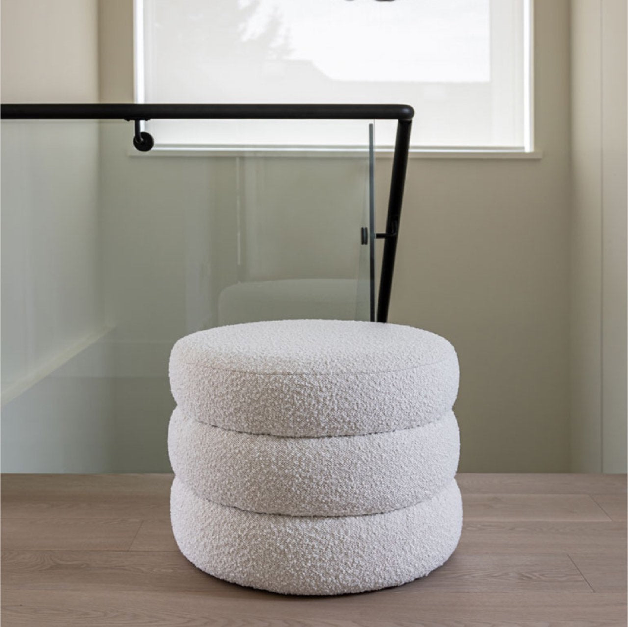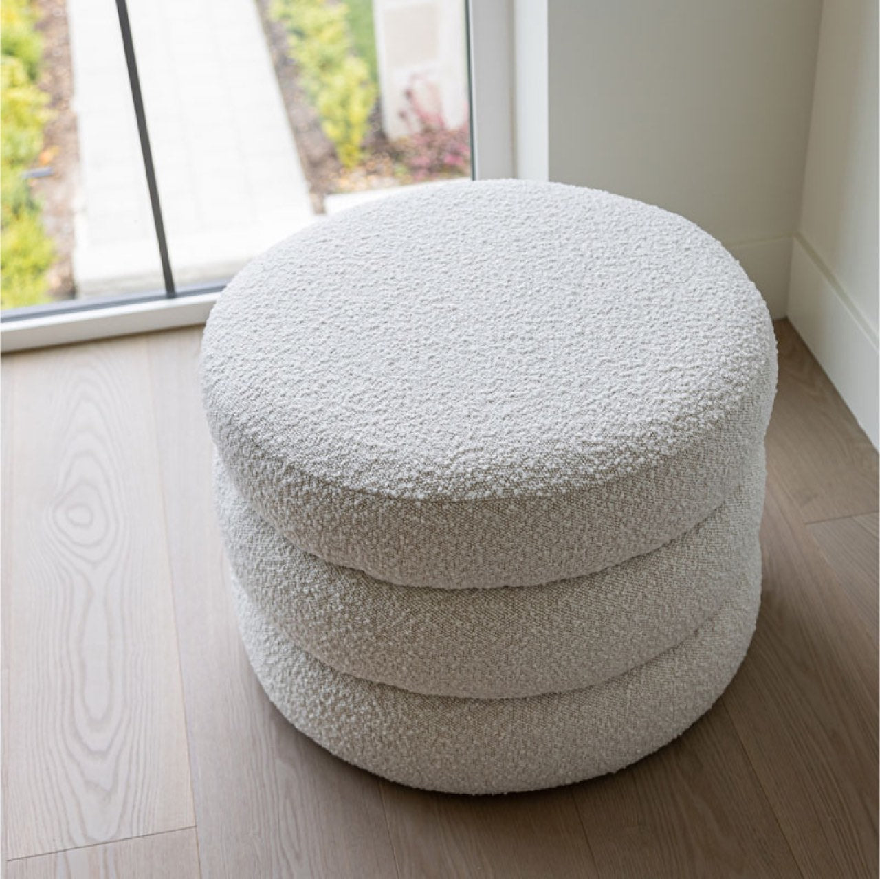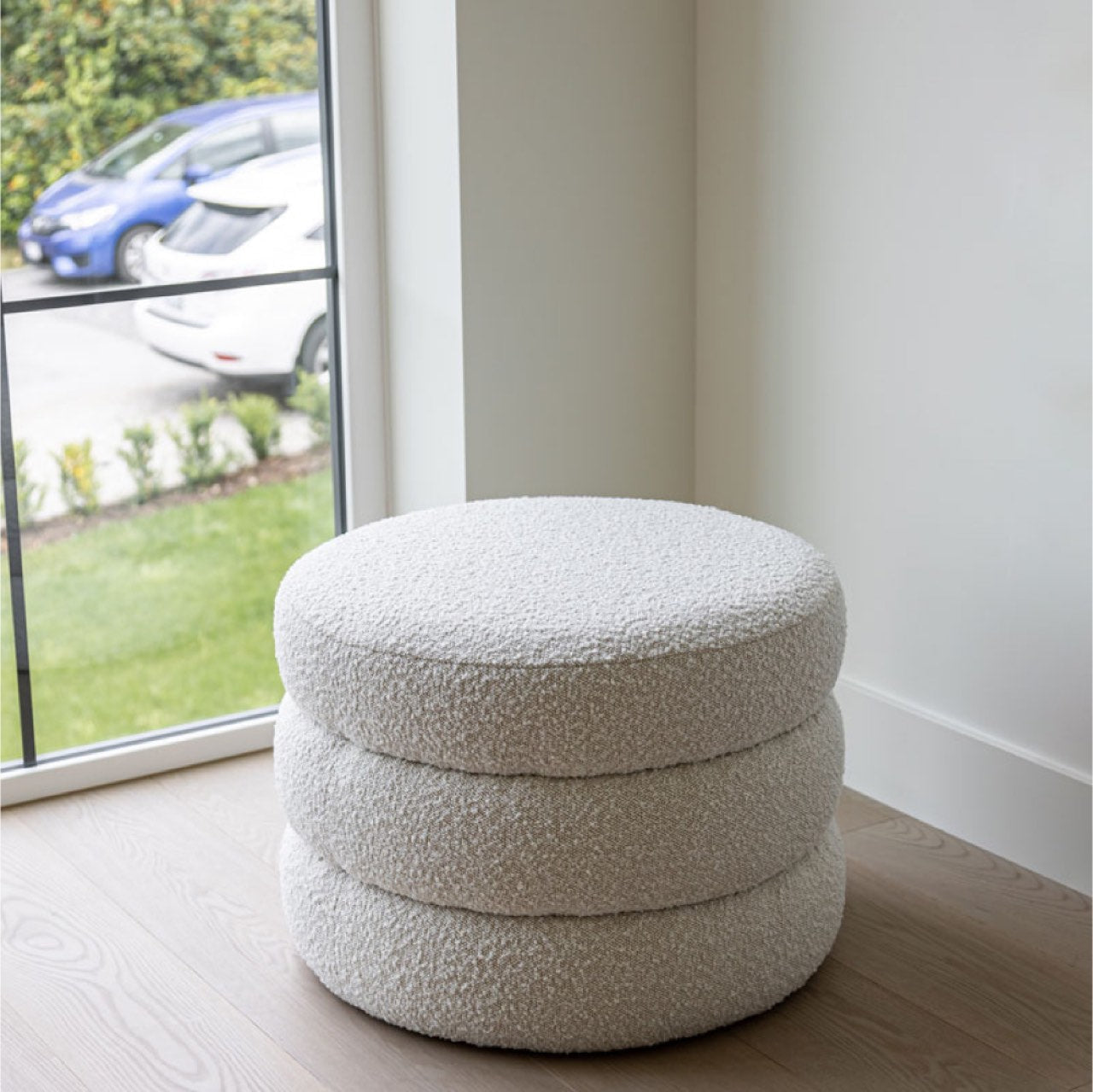 We are in love with the sculptural profile of the Fiel Ottoman. Its stacked cushions create curves and modern styling that bring character to any living room, bedroom, entryway, or office. Lightweight and versatile, Fiel is easy to move wherever needed—use it for extra seating, as a footrest, or even as a side table with a decorative tray. Upholstered in on-trend off-white bouclé, it’s a stylish and practical accent for any space.