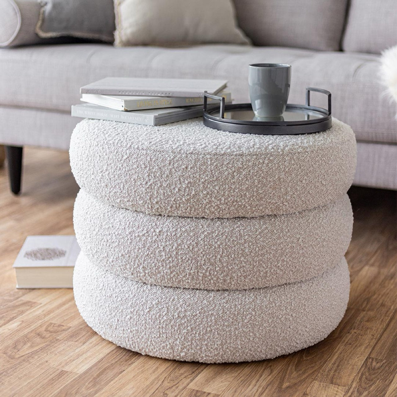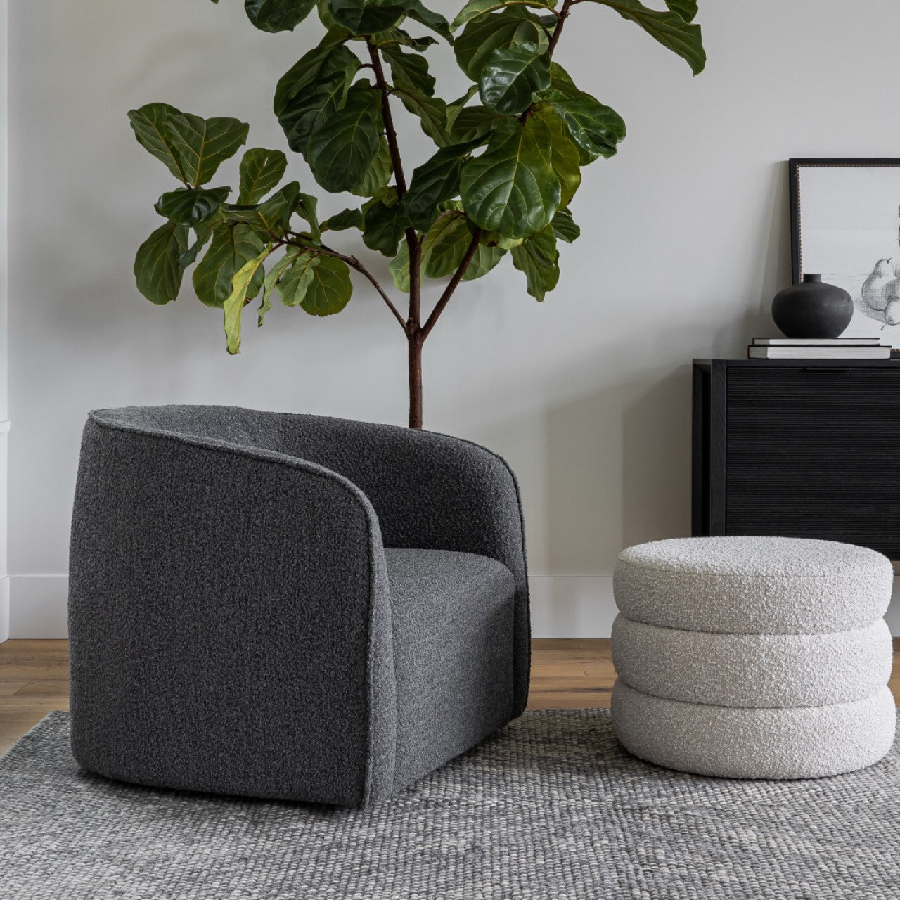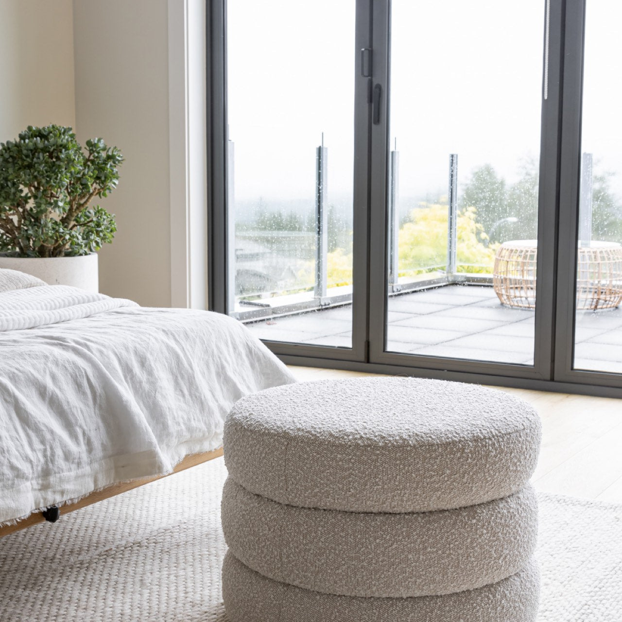 We are in love with the sculptural profile of the Fiel Ottoman. Its stacked cushions create curves and modern styling that bring character to any living room, bedroom, entryway, or office. Lightweight and versatile, Fiel is easy to move wherever needed—use it for extra seating, as a footrest, or even as a side table with a decorative tray. Upholstered in on-trend off-white bouclé, it’s a stylish and practical accent for any space.