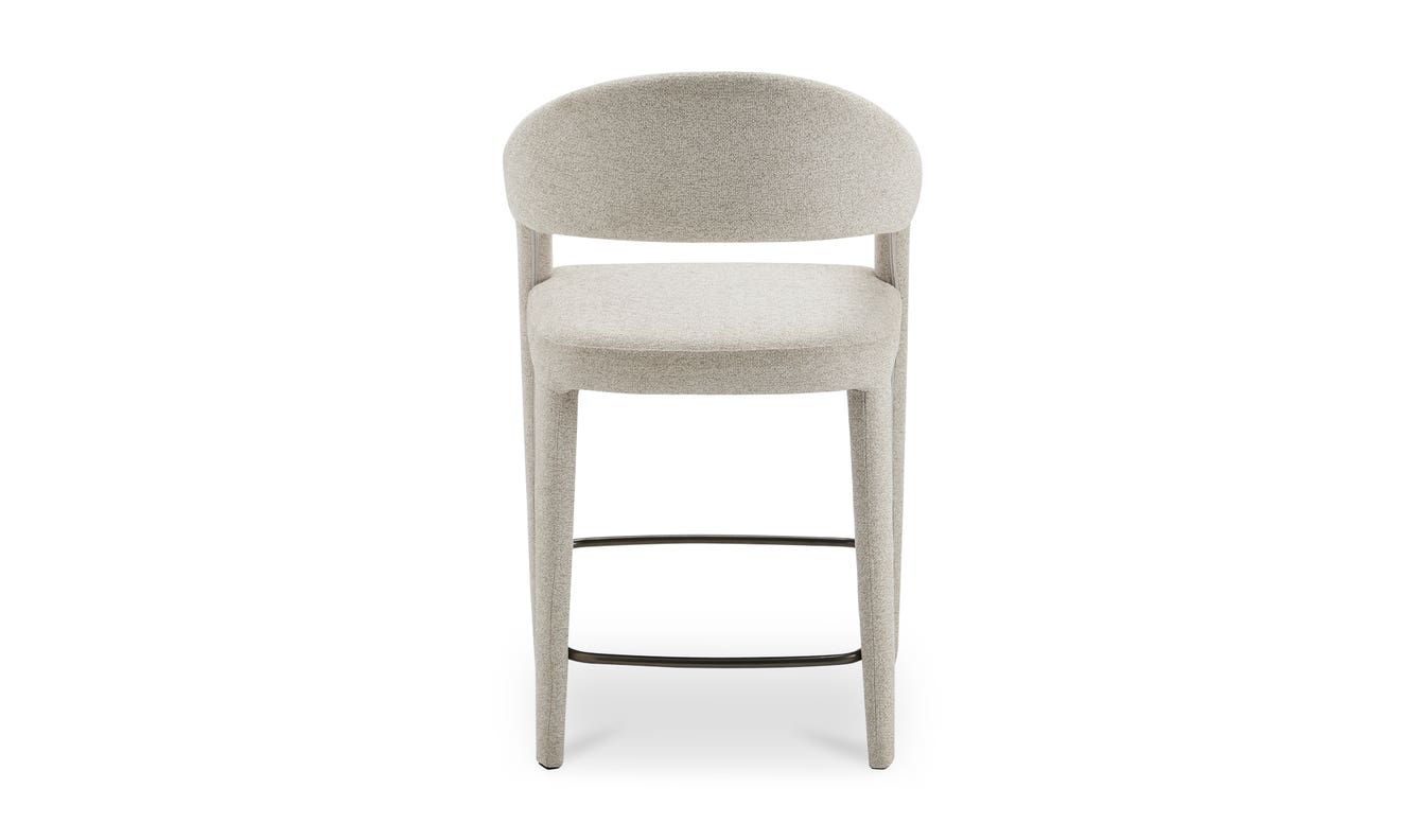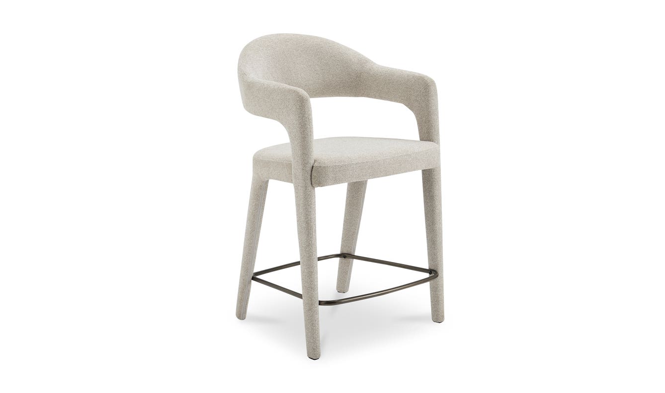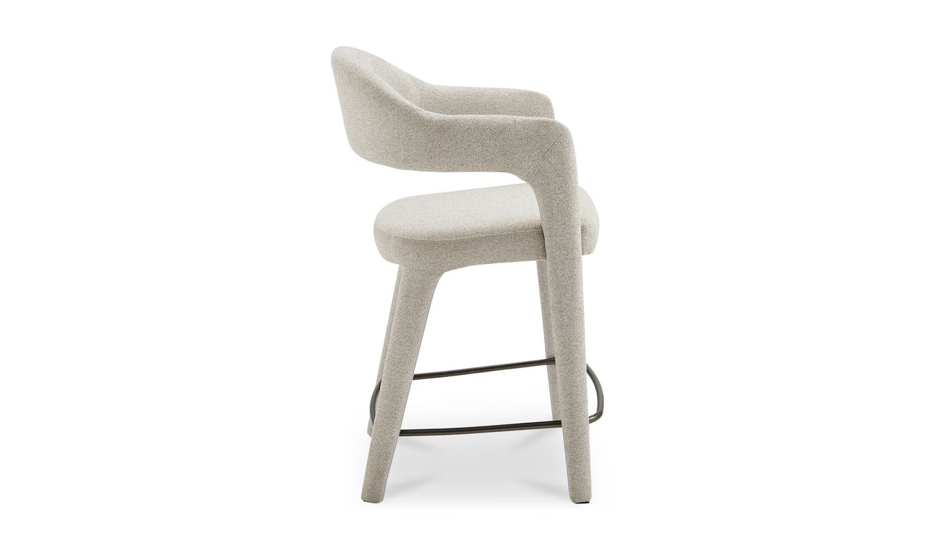 The Martens counter stool features an open barrel back and a continuous curve from leg to frame. Its Performance fabric is complemented by generously padded seating, marrying comfort with a clean, uncluttered design. Armrests introduce a note of formality, while the airy back lends a touch of lightness and sophistication.