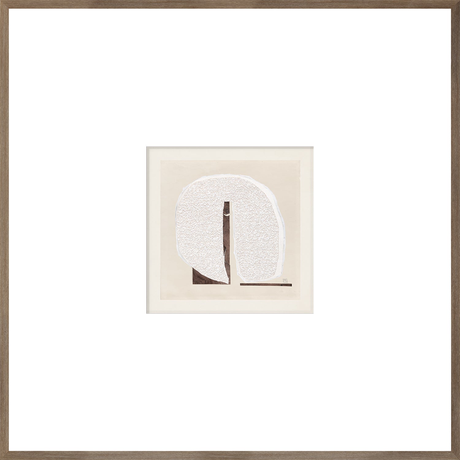 Una notable composición estilo collage con texturas de bouclé y chapa. Pequeños cuadrados íntimos dentro de una amplia lámina mate y acabados con un marco de madera oscura.