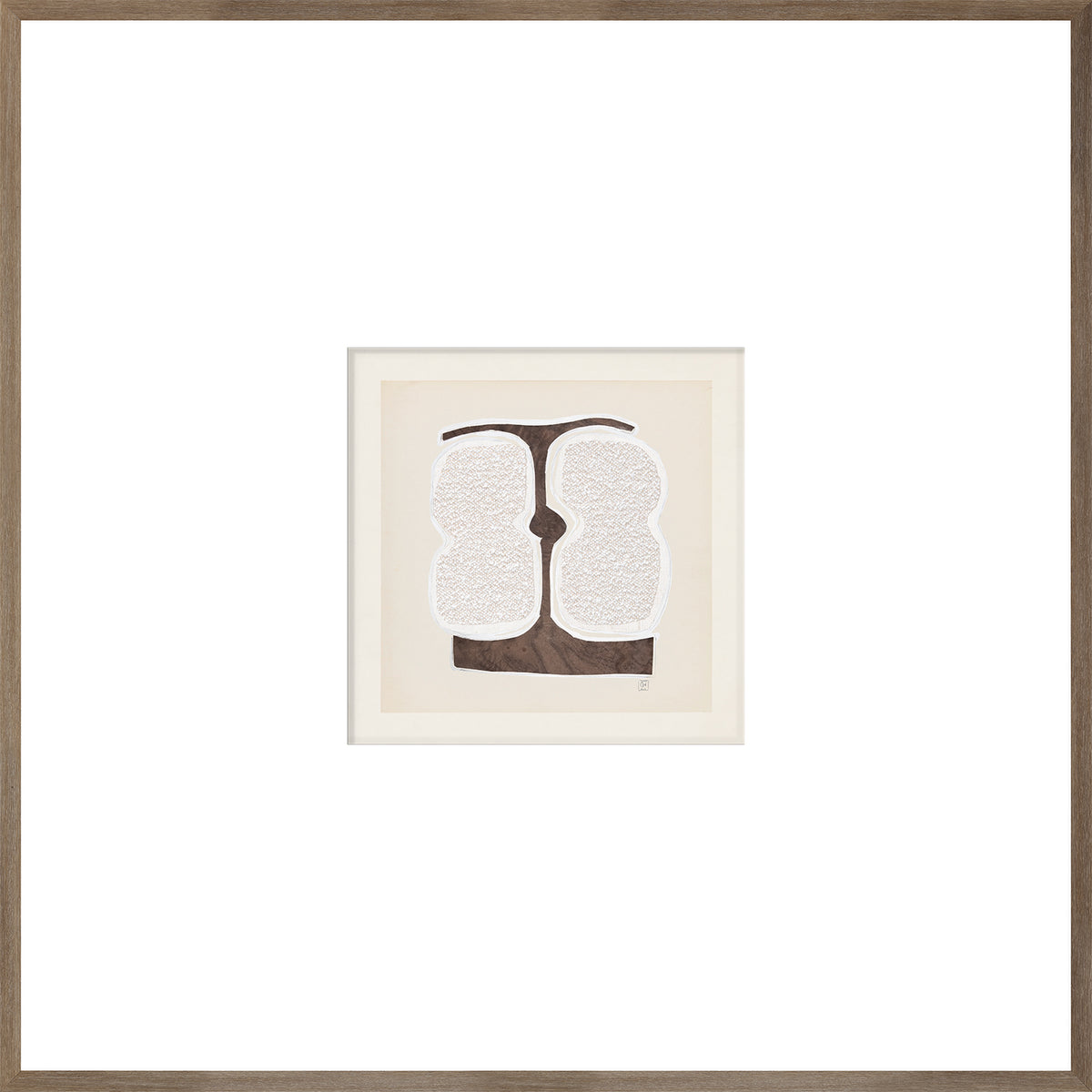 Una notable composición estilo collage con texturas de bouclé y chapa. Pequeños cuadrados íntimos dentro de una amplia lámina mate y acabados con un marco de madera oscura.