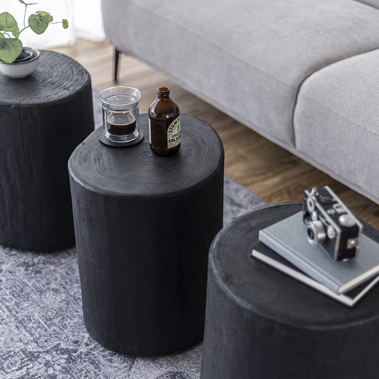Everyone is going to want to know where you got these gorgeous black stumps. Handmade from sustainable solid paulownia wood and finished in a dramatic matte satin black stain, each piece is unique in colour, composition, and form. Perfect beside a sofa, next to an accent chair, or in a bedroom, these versatile stumps can be used as side tables or accent stools. Suitable for covered outdoor use as well.